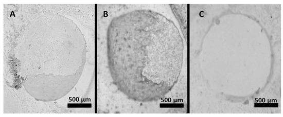 Representative stereomicroscope images (40× magnification) of specimens from the microshear bond strength test, illustrating (A) cohesive, (B) mixed, and (C) adhesive failure modes. Scale bars = 500 µm.