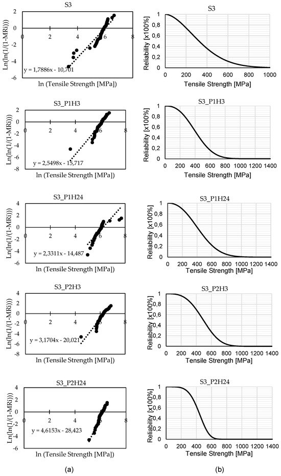 To determine these parameters, tensile strength data were ranked in ascending order, and the median rank regression method was applied to generate a Weibull probability plot. The median rank position, , for each data point was calculated according to: