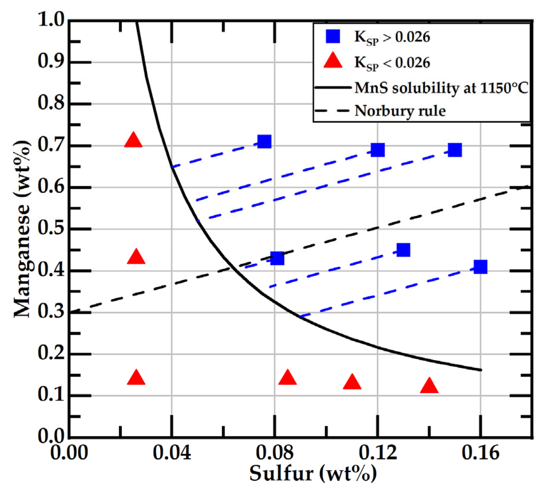 KSP | Solubility product, (wt%Mn) (wt%S), corresponding to initial concentrations |