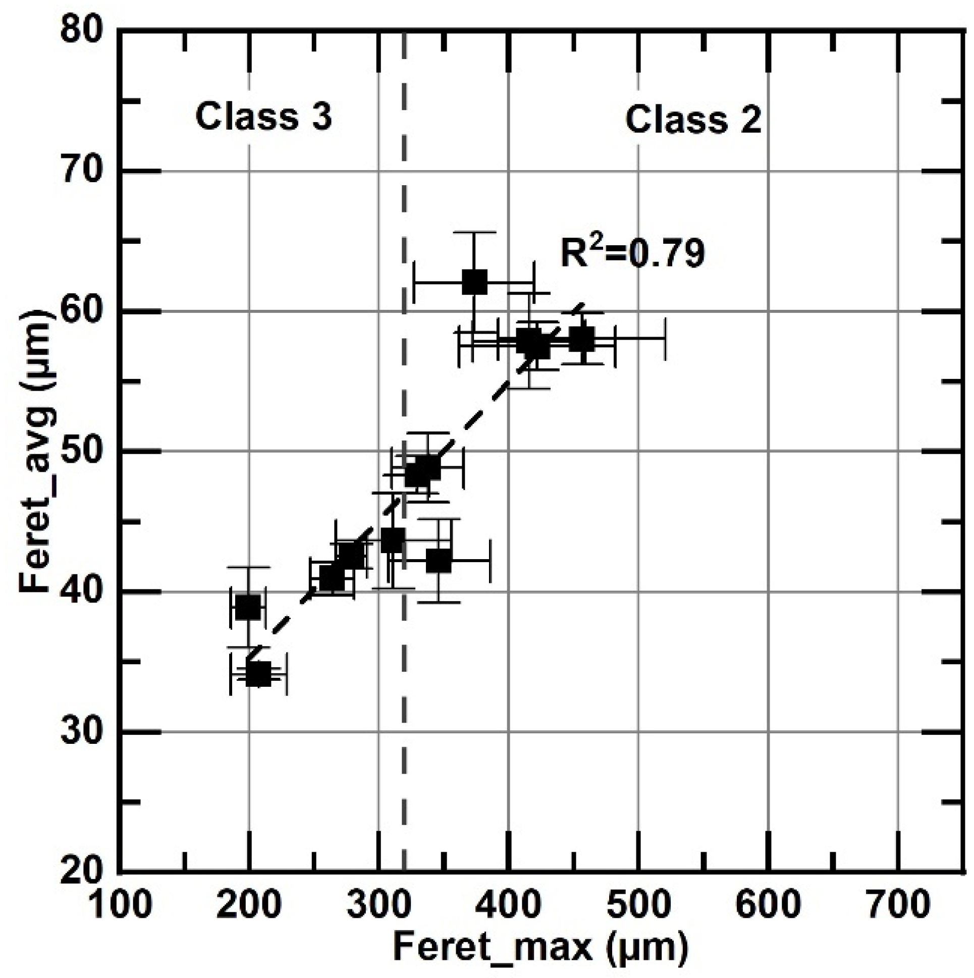 - It was found that the classification of flake size by class, based on Feret_max, according to ASTM A247-19 [30], implies a loss of important information about the effect of Mn and S on the length of graphite flakes. Samples of the same size class could have a noticeable difference in the flake’s length; for example, samples L-026 and M-160 show very different Feret_avg values, 62 and 42 μm, but both are class two. The frequency histograms and the cumulative distribution of Feret values show that average Feret values are better descriptors of the whole distribution of the flake’s size.