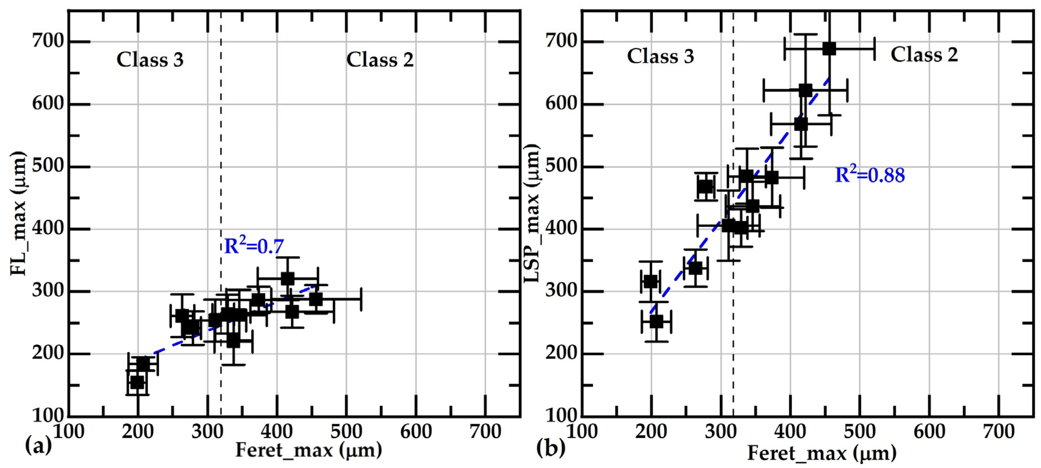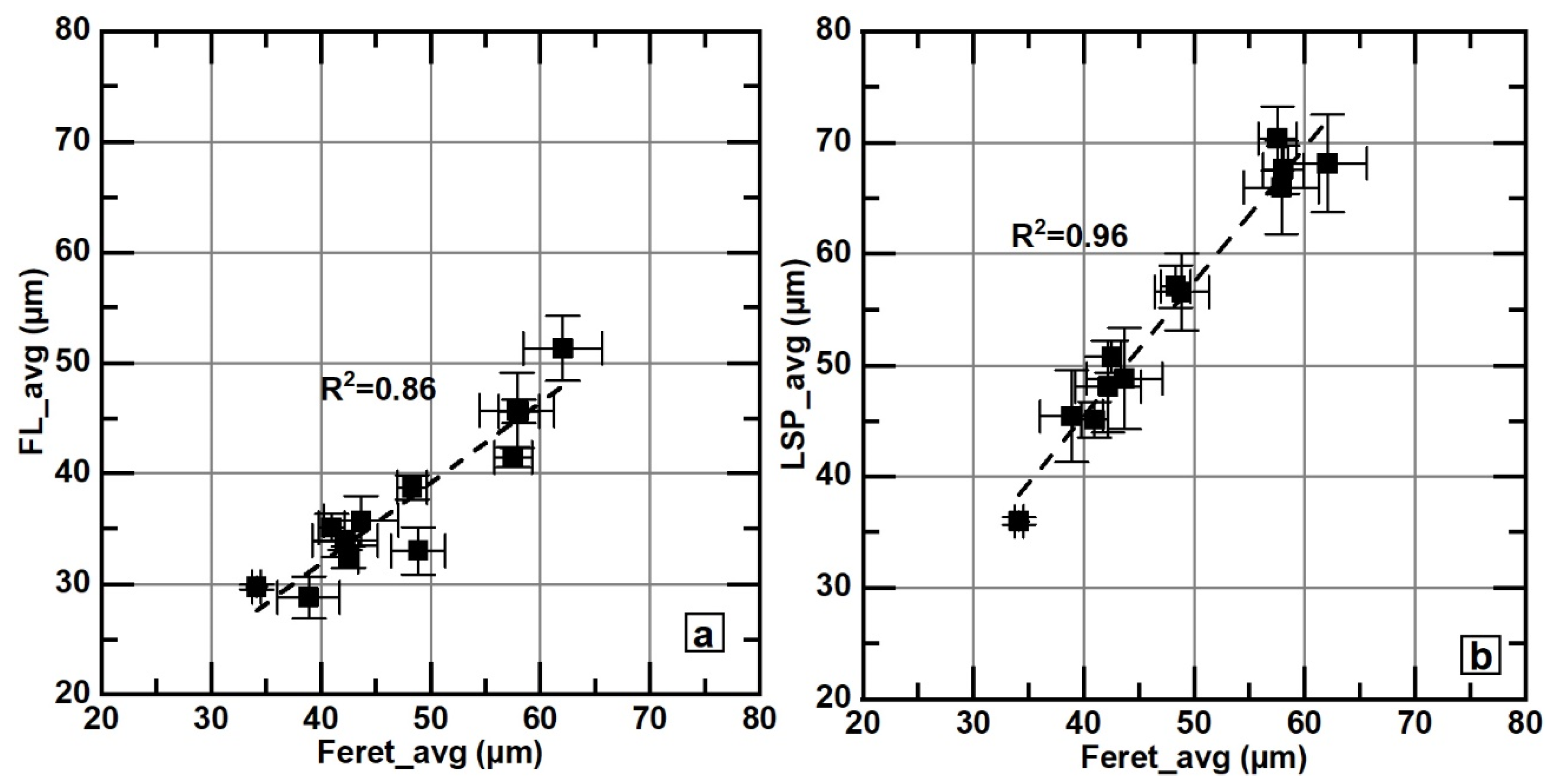 - These results also show that for flake size comparison between samples, all parameters tested here, Feret_avg, Feret_max, FL_max, FL_avg, LSP_avg and LSP_max, are equivalent.