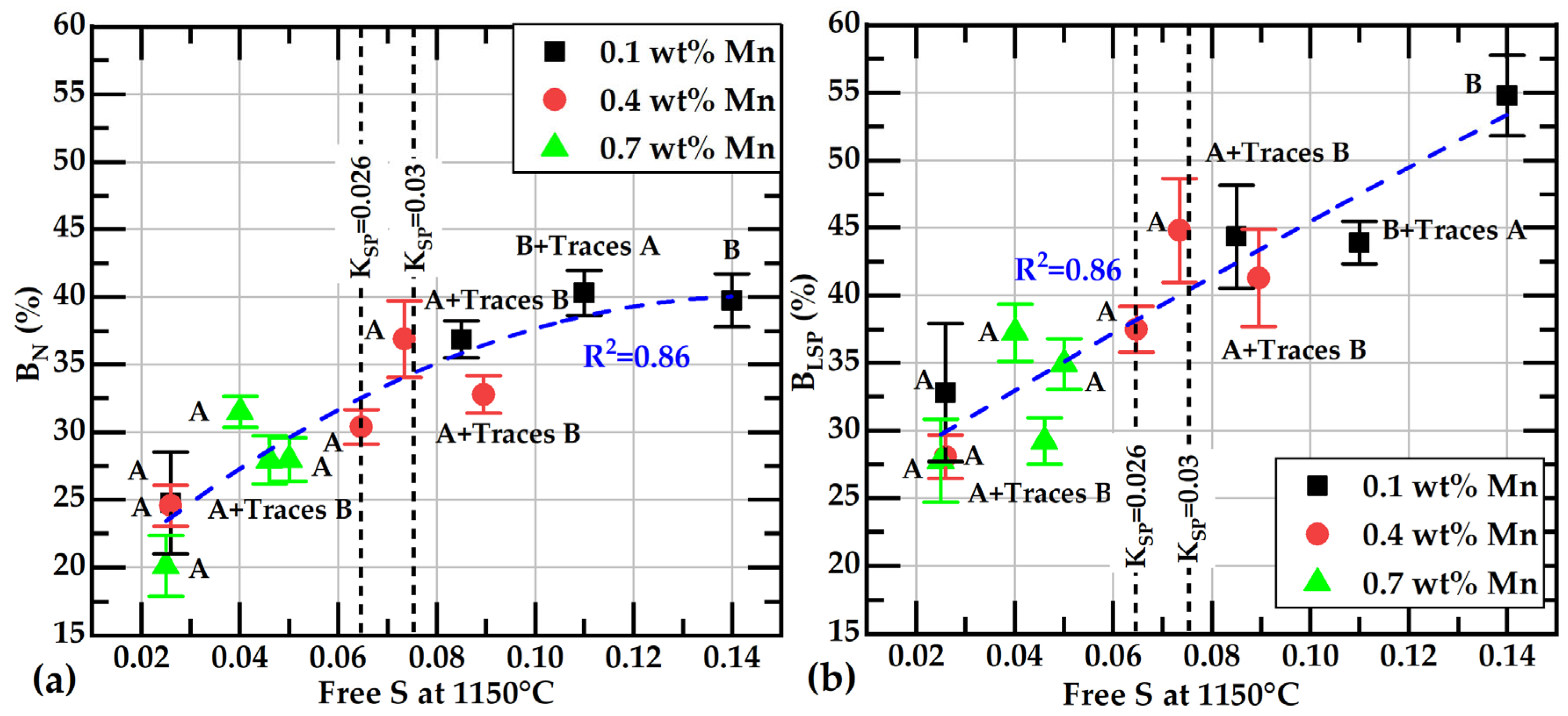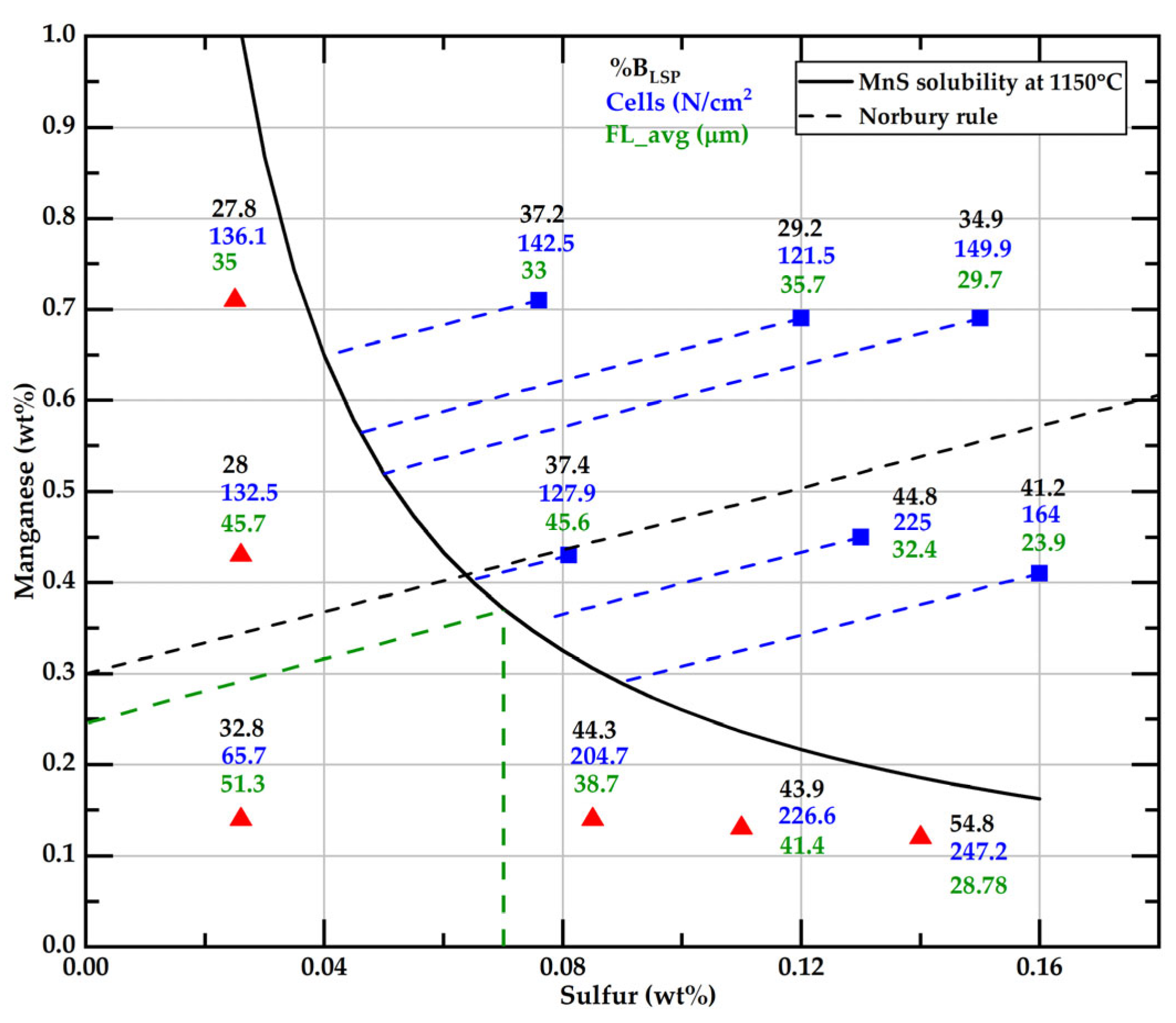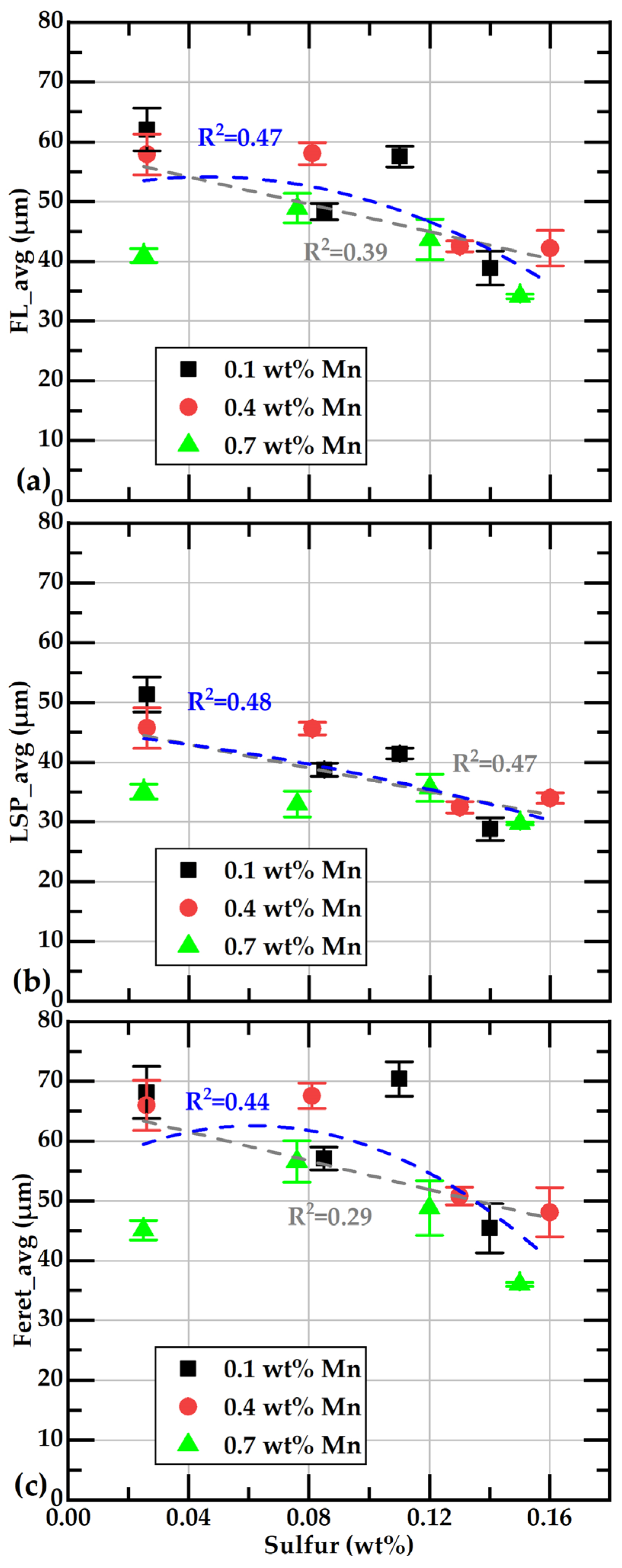 - The larger flake sizes were observed in the samples with the lower content in both S and Mn. The effect of Mn content on Feret_avg or FL_avg values is less significant in the samples with sulfur contents over 0.12 wt% than in samples under 0.12 wt%S. At the highest sulfur contents, the size of the graphite flakes is the smallest at all Mn concentrations.