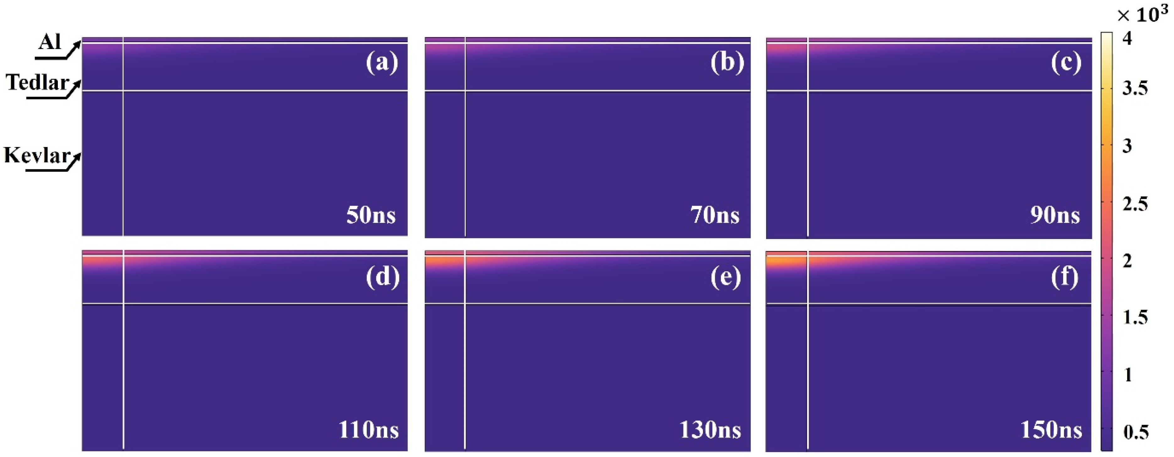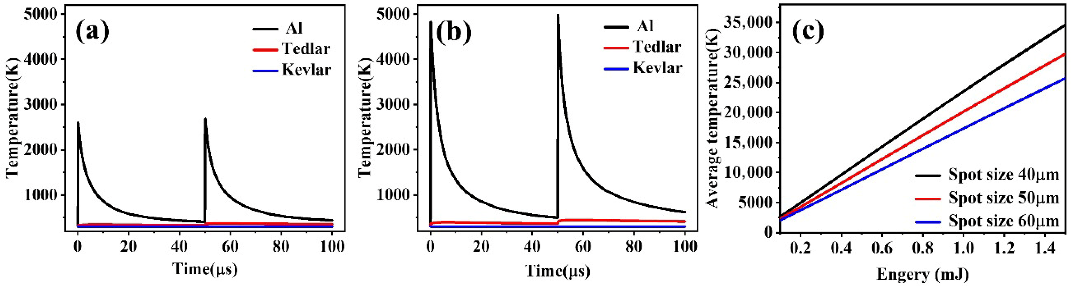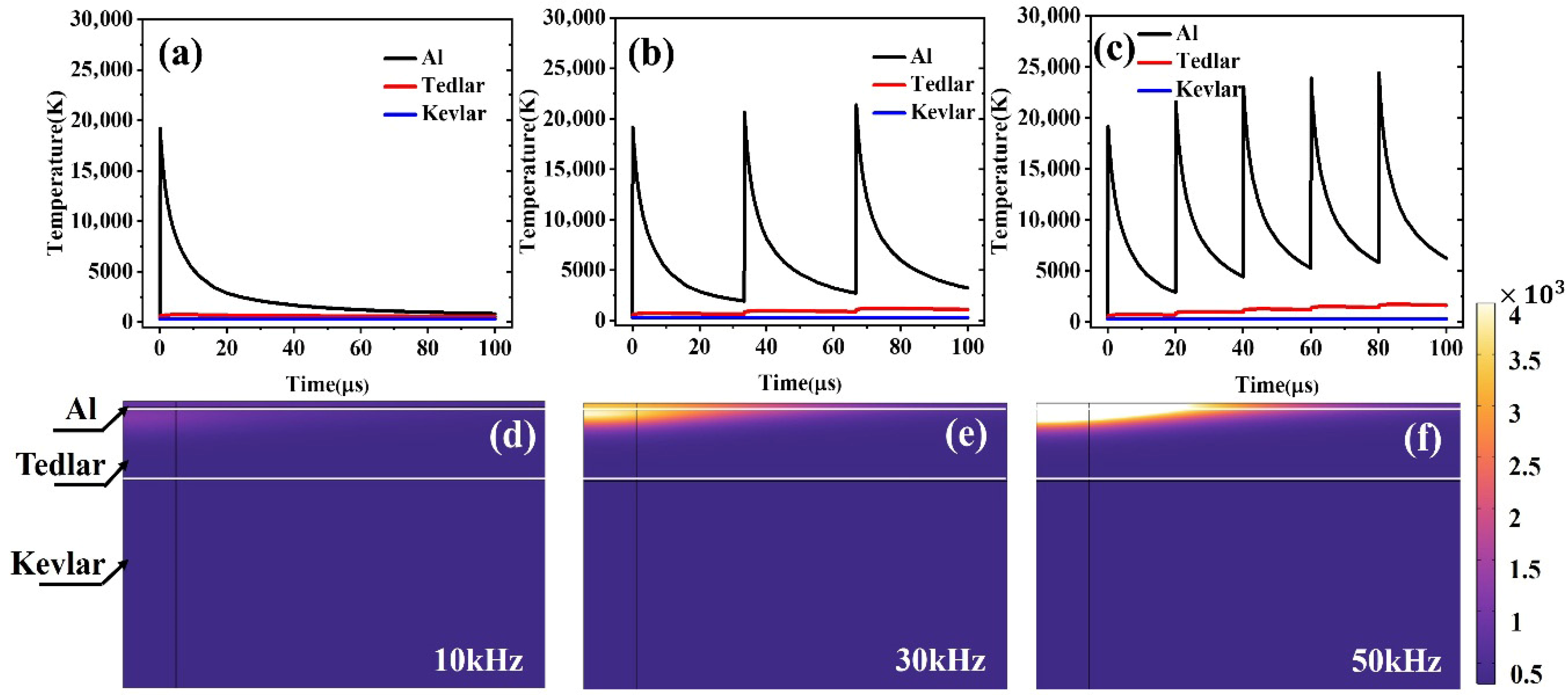 - Effect of Pulse Width: Pulse width significantly influences the thermo-mechanical response of the Al–Tedlar–Kevlar composite film. At fixed pulse energy, its effect on the temperature field is minimal, with a stable overall response. Under constant peak power, however, longer pulses increase per-pulse energy and extend thermal coupling, intensifying heat accumulation, temperature gradients, nonuniform expansion, and thermal stresses. Thus, in high–peak power laser processing, pulse width governs both thermal input and stress evolution, making it a critical parameter for optimization.