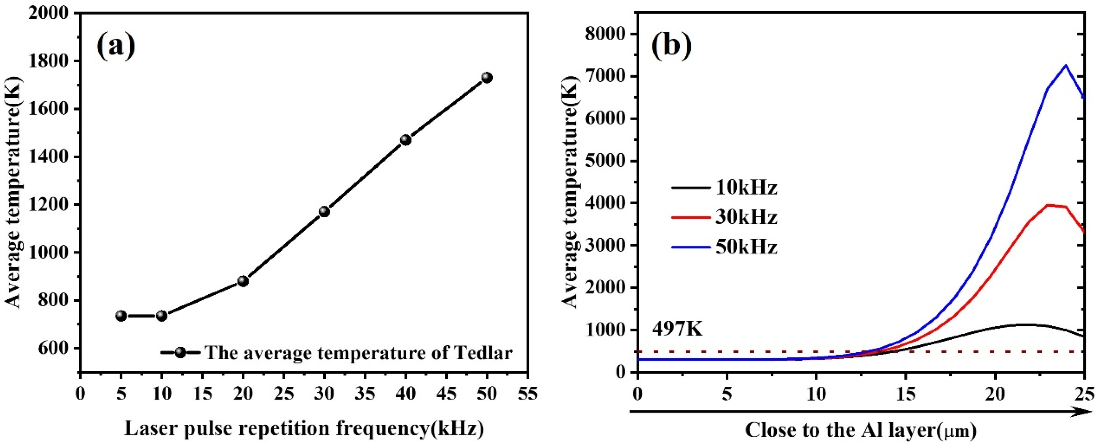 - Effect of Repetition Frequency: The laser repetition frequency significantly influences heat accumulation and stress evolution. An increase in frequency raises the heat input density and reduces the thermal diffusion interval, resulting in a sharp rise in localized temperature. Particularly when the frequency exceeds 20 kHz, distinct thermal stress concentration zones form within the material, increasing the risk of membrane cracking and interfacial delamination. Therefore, a balance must be achieved between processing efficiency and thermal stability.
