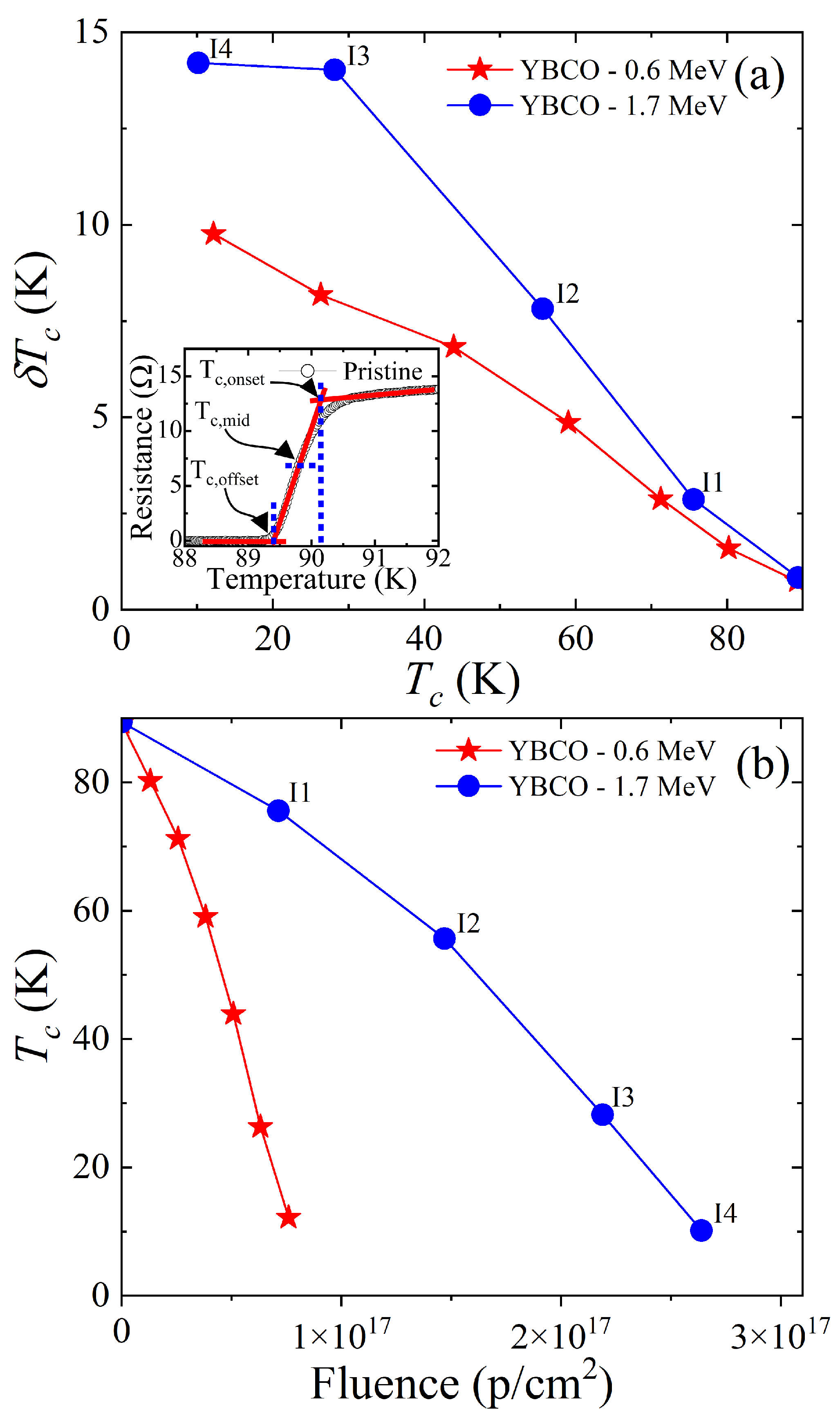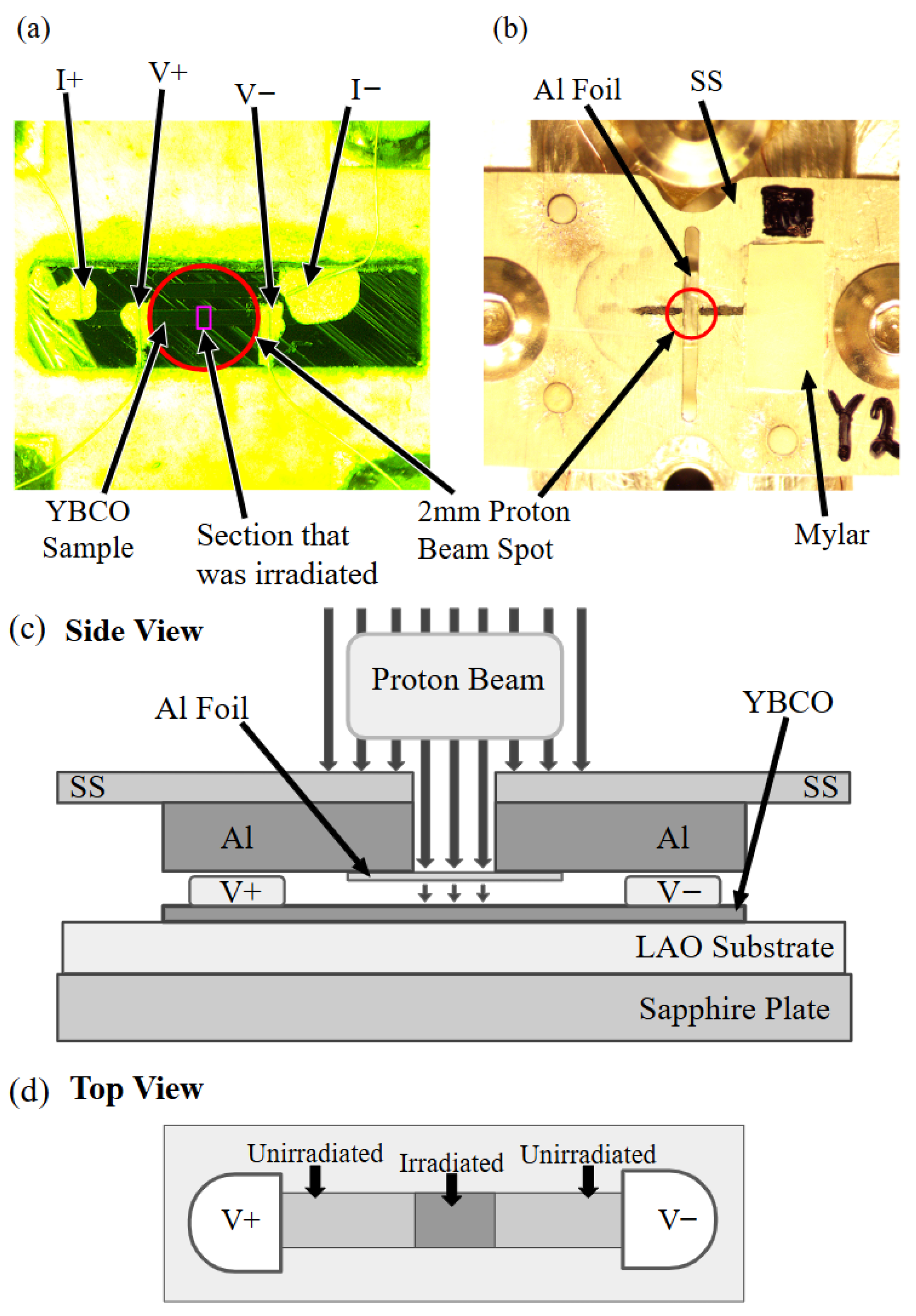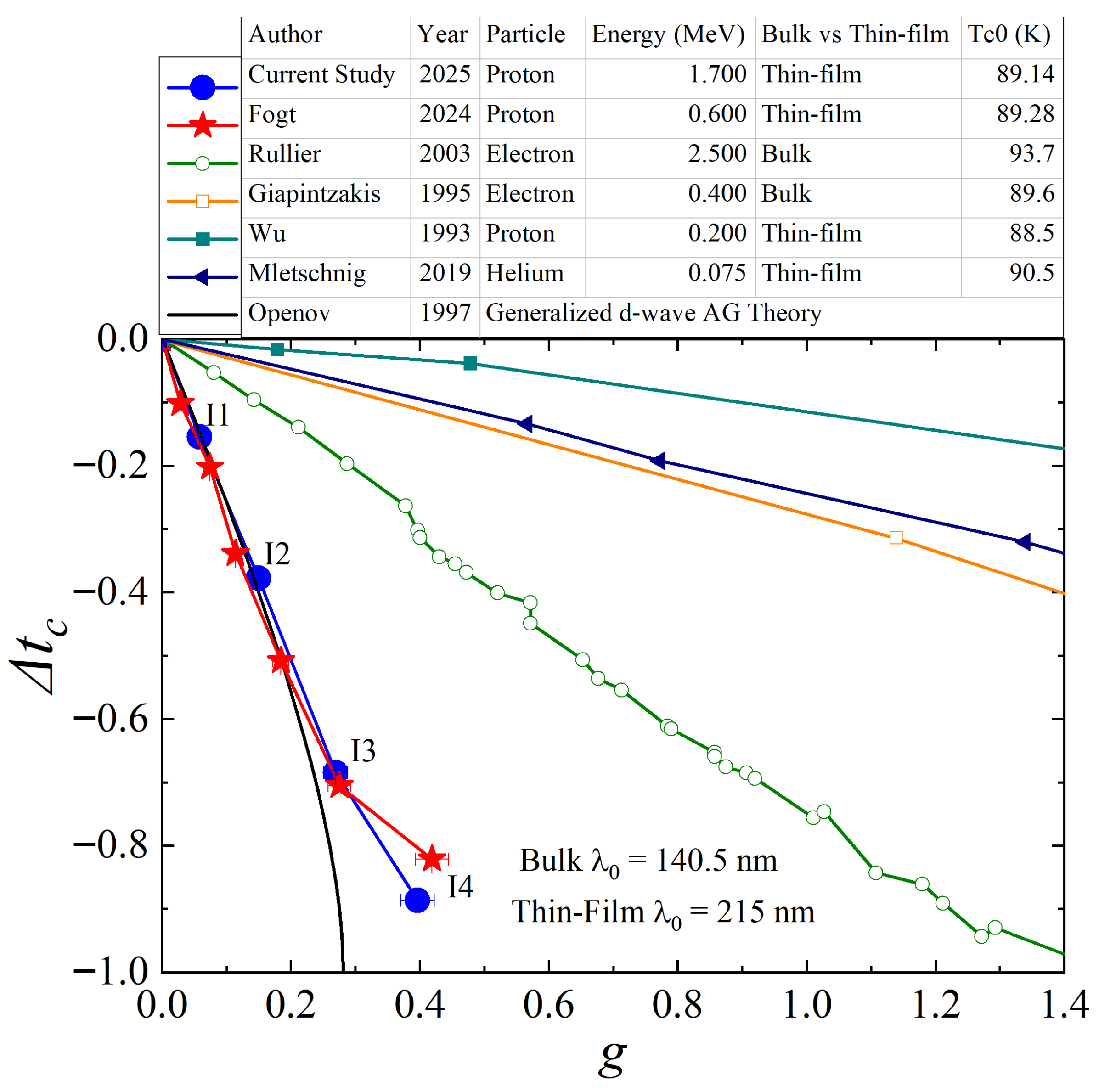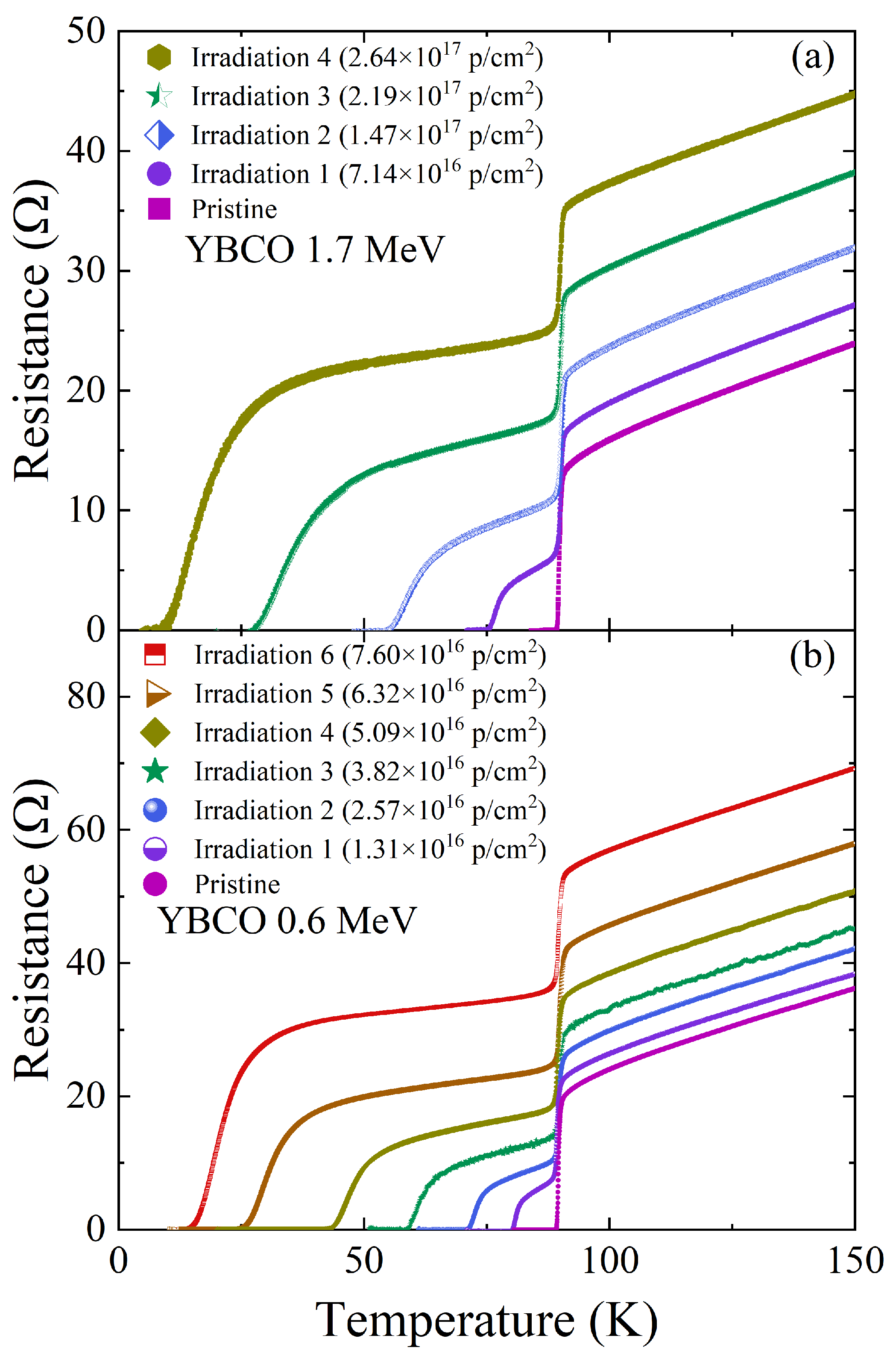 - Fogt, J.; Weeda, H.; Harrison, T.; Miles, N.; Cho, K. Effect of Proton Irradiation on Thin-Film YBa2Cu3O7 Superconductor. Materials 2024, 17, 4601. [Google Scholar] [CrossRef] [PubMed]
