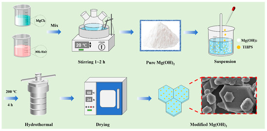 Modified magnesium hydroxide was prepared via a one-pot method at high temperature. First, the MH wet filter cake obtained from step 2.2 was dispersed in 100 mL of a 5 M NaOH solution to form a suspension. After stirring at 1800 rpm for 30 min to ensure uniform dispersion, THPS was subsequently added as a modifier. The suspension was then transferred to a Teflon-lined stainless-steel autoclave (Xingjian Chemical Machinery Co., Ltd., Taizhou, China) at 200 °C for 4 h. After naturally cooling to ambient temperature, the product underwent filtration, was washed thoroughly, and then dried at 60 °C over 24 h to obtain highly dispersible modified Mg(OH)2. The modified products were labeled as MHP-X, where “X” represents the weight percentage of THPS added relative to the mass of the Mg(OH)2. For example, MHP-1, MHP-3, and MHP-5 contain 1 wt.%, 3 wt.%, and 5 wt.% of THPS. The preparation process is shown in Figure 1.