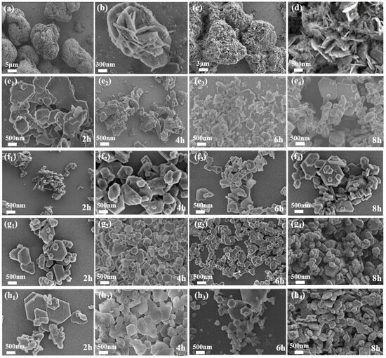 SEM images of magnesium hydroxide prepared under different conditions: (a,b) unmodified sample at 20 °C; (c,d) sample modified at low-temperature (60 °C) and 8 h; (e–h) samples modified under hydrothermal conditions at; (e1–e4) 160 °C; (f1–f4) 180 °C; (g1–g4) 200 °C; and (h1–h4) 220 °C.