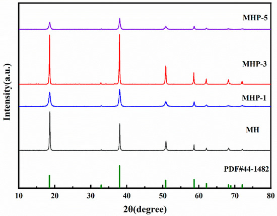 The XRD patterns of MH, MHP-1, MHP-3, MHP-5, and the standard MH.