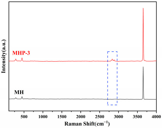 Figure 5 shows the Raman spectra of pure MH and MHP-3. The symmetric stretching mode corresponding to –OH is appearing at 3652 cm−1. The peaks observed at 282 and 447 cm−1 correspond to the vibrational modes of MH [55,56]. A new peak observed (2867 cm−1) in the MHP-3 within the range of 2800–3000 cm−1, is assigned to the C–H stretching vibrations [57,58,59,60].