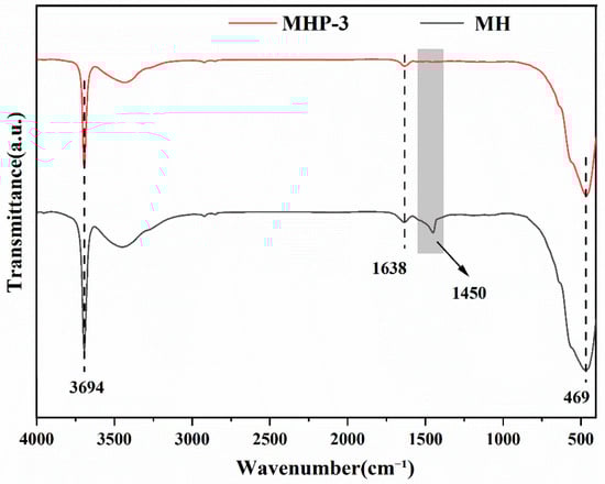 FTIR offers valuable information on functional groups and bonding changes, enabling the analysis of chemical interactions between magnesium hydroxide and THPS. Figure 6 shows the FTIR (for MH and MHP-3) spectra. The remarkably sharp and intense peak at 3694 cm−1 is assigned to the O–H stretching vibration of MH, while the peak at 469 cm−1 can be assigned to the Mg–O vibration [61]. Additionally, a weak peak at 1638 cm−1 can be assigned to the bending vibration of crystal water (H–O) and P–C stretching vibration. It is important to point out clearly that the peak at 1450 cm−1 can be ascribed to the –OH bending vibration of magnesium hydroxide, which disappeared in MHP-3, indicating that the –OH groups of magnesium hydroxide reacted with THPS.