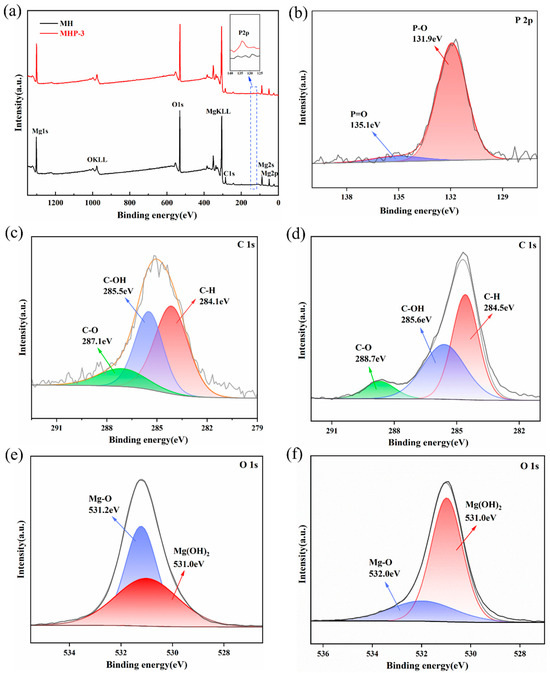 (a) XPS survey spectra; (b) P 2p XPS spectra of MHP-3; (c) C 1s XPS spectrum of MH; (d) C 1s XPS spectrum of MHP-3; (e) O 1s XPS spectrum of MH and (f) O 1s XPS spectrum of MHP-3.