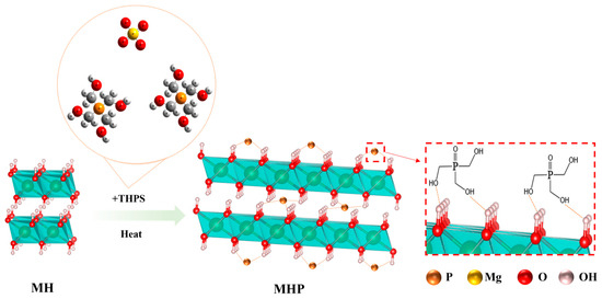 Phosphorus-containing compounds can be combined with MH flame-retardants to achieve synergistic effects, enhancing flame-retardant performance [30,31] through gas-phase and condensed-phase flame-retardant mechanisms [32,33,34]. Phosphorus-containing species released during combustion can react with gas-phase radicals (·OH, ·H, etc.), effectively terminating the flame propagation process. In the condensed phase, the stable phosphorus-carbon char layer forms and acts as a barrier layer to block heat and pyrolysis products. Furthermore, the phosphorus compounds promote the polymer matrix’s carbonization, improving the thermal stability and structural integrity of the residual char. The dual mechanism improves flame retardancy by slowing down the pyrolysis process as well as shielding the substrate beneath from additional deterioration. To date, various methods have been developed to obtain phosphorus-modified magnesium hydroxide [35,36,37]. Zhao et al. [38] studied a hierarchical core–shell architecture flame-retardant, in which magnesium hydroxide is modified by cyclic cross-linked polyphosphazene (MH@CPZN), with the samples significantly reinforcing the flame resistance of styrene-butadiene-styrene asphalt (SBSA) while also elevating the asphalt’s fire safety and smoke suppression performance. Yao et al. [39] reported that MH modified with PZN (MH-PZPI-BA) showed enhanced flame-retardant performance and improved smoke suppression properties. Among various phosphorus-based compounds, Tetrakis(hydroxymethyl)phosphonium sulfate (THPS) is a colorless and transparent liquid that readily decomposes into non-toxic substances, making it an eco-friendly and sustainable compound [40,41]. THPS contains four reactive hydroxymethyl groups and is capable of inserting itself into the interlayer spaces of MH to increase the generation of a stable protective layer. Meanwhile, as a halogen-free phosphorus source, THPS can further enhance the flame-retardant effect of magnesium hydroxide through gas-phase free radical capture and solid-phase char formation [42].