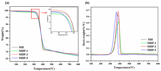 Thermogravimetric analysis of MH, MHP-1, MHP-3, and MHP-5 in N2. (a) TG and (b) DTG curves.