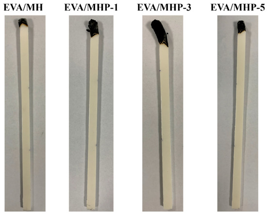 Digital images of neat EVA/MH and EVA/MHP composites after the LOI test.
