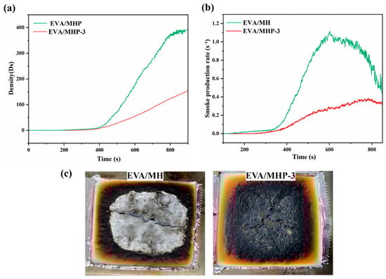 (a) Smoke density; (b) smoke production rate; (c) char residues of EVA/MH and EVA/MHP-3 composites.