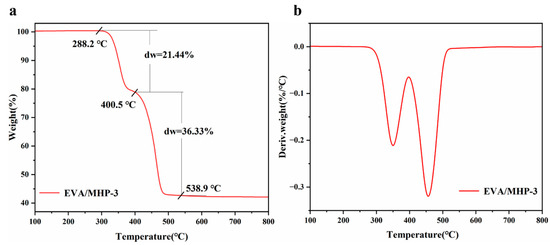 To achieve a deeper and more comprehensive insight into how EVA/MHP materials perform in terms of flame retardancy, the thermal degradation behavior was studied. The TGA and DTG curves of EVA/MHP-3 in N2 atmosphere are shown in Figure 12. The composite undergoes thermal decomposition predominantly in two distinct stages: 280–390 °C and 400–540 °C. The initial decomposition starts at 288.2 °C, with a weight loss of 21.44%. MHP decomposition produces phosphorus-containing compounds and releases water vapor, which dilutes flammable gases and interrupts radical chain reactions in the gas phase. The primary decomposition process of EVA/MHP-3 occurred mainly between 400 and 540 °C.