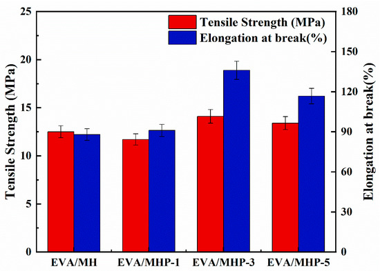 A detailed assessment was conducted on the mechanical characteristics of EVA/MH composites, with tensile strength and elongation at break, as presented in Figure 14; relevant data are shown in Table 4.