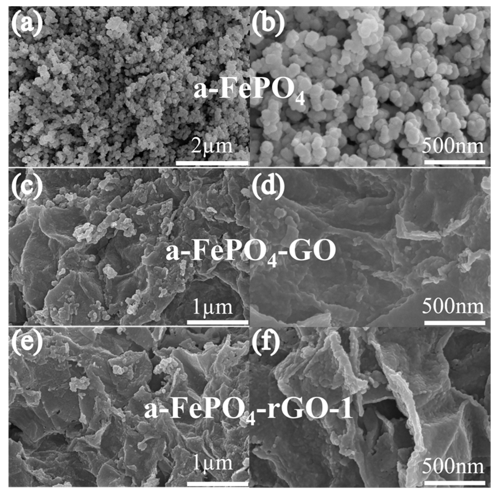 Figure 2 shows the scanning electron microscope (SEM) images of a-FePO4, a-FePO4-GO, and a-FePO4-rGO-1. As can be seen in Figure 2a,b, the a-FePO4 sample without GO exhibits a porous spherical morphology with particle sizes ranging from 30 to 50 nm, which is governed by the principle of minimal free energy. Figure 2c,d reveal that the particle size of a-FePO4-GO is smaller than that of pure a-FePO4. This reduction is due to the incorporation of GO, which forms a two-dimensional layered structure and provides a high specific surface area for a-FePO4. Moreover, the active oxygen-containing functional groups on the GO surface facilitate the uniform distribution of a-FePO4 nanoparticles, thereby inhibiting their agglomeration and leading to the formation of a well-dispersed a-FePO4-GO composite. Although the a-FePO4-rGO-1 composite (Figure 2e,f) may undergo the transformation from GO to rGO during high-temperature reduction, no significant difference in composite morphology was observed compared with a-FePO4-GO. Additionally, as shown in Figure S1, both a-FePO4-rGO-2 and a-FePO4-rGO-3 display a three-dimensional porous microstructure, with particle sizes also in the range of 30–50 nm. However, under calcination, the thermal decomposition of the precursor a-FePO4-GO enhances the surface activity of particles on the GO sheets, promoting particle diffusion and interaction with adjacent particles, which ultimately leads to the agglomeration of a-FePO4 particles.