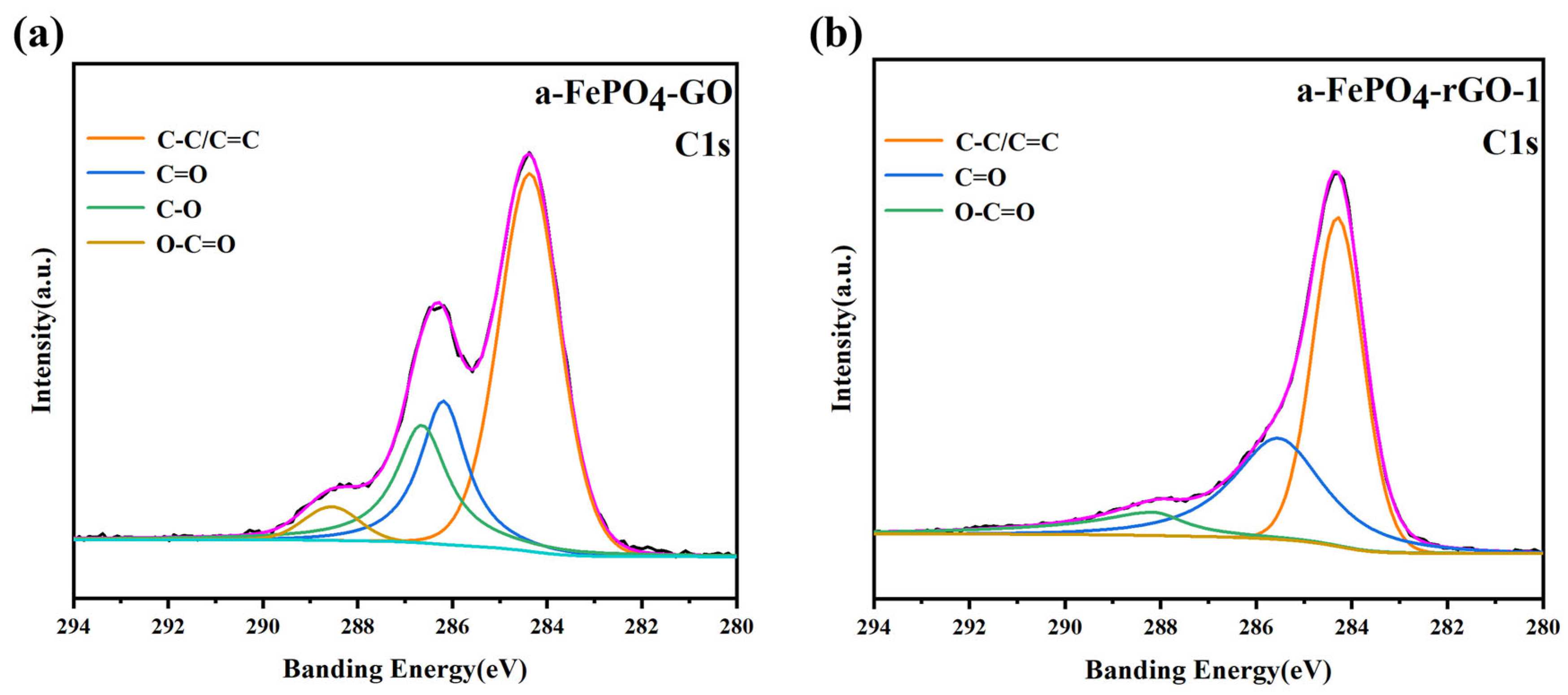 XPS is widely employed to analyze the surface elemental composition and chemical states of materials. Figure S2a–c shows the XPS survey spectra of a-FePO4 and its composites with GO, confirming the presence of Fe, P, O, and C in all samples. Figure 3a,b display the high-resolution C 1s spectra of a-FePO4-GO and a-FePO4-rGO-1. After peak deconvolution, the C 1s spectra of a-FePO4-GO (Figure 3a) exhibits four peaks at binding energies of 284.8 eV, 286.3 eV, 286.9 eV, and 288.3 eV, corresponding to C–C/C=C, C=O, C–O, and O–C=O bonds, respectively, indicating the successful incorporation of a-FePO4 into the layered GO structure. In contrast, the C 1s spectra of a-FePO4-rGO-1 (Figure 3b) show three distinct peaks at 284.8 eV, 286.3 eV, and 288.3 eV, assigned to C–C/C=C, C=O, and O–C=O, respectively [28]. Compared with a-FePO4-GO, the peak intensities of C=O and C–O are significantly reduced, which can be attributed to the thermal reduction in GO to rGO during the high-temperature process, resulting in the removal of most oxygen-containing functional groups. However, the O–C=O peak remains present without a drastic decrease in intensity, suggesting that O–C=OH groups are relatively stable even under high-temperature treatment. These results demonstrate that XPS provides critical insights into the chemical changes during the reduction process, confirming the effective formation of rGO and the retention of certain functional groups influencing the composite’s properties.