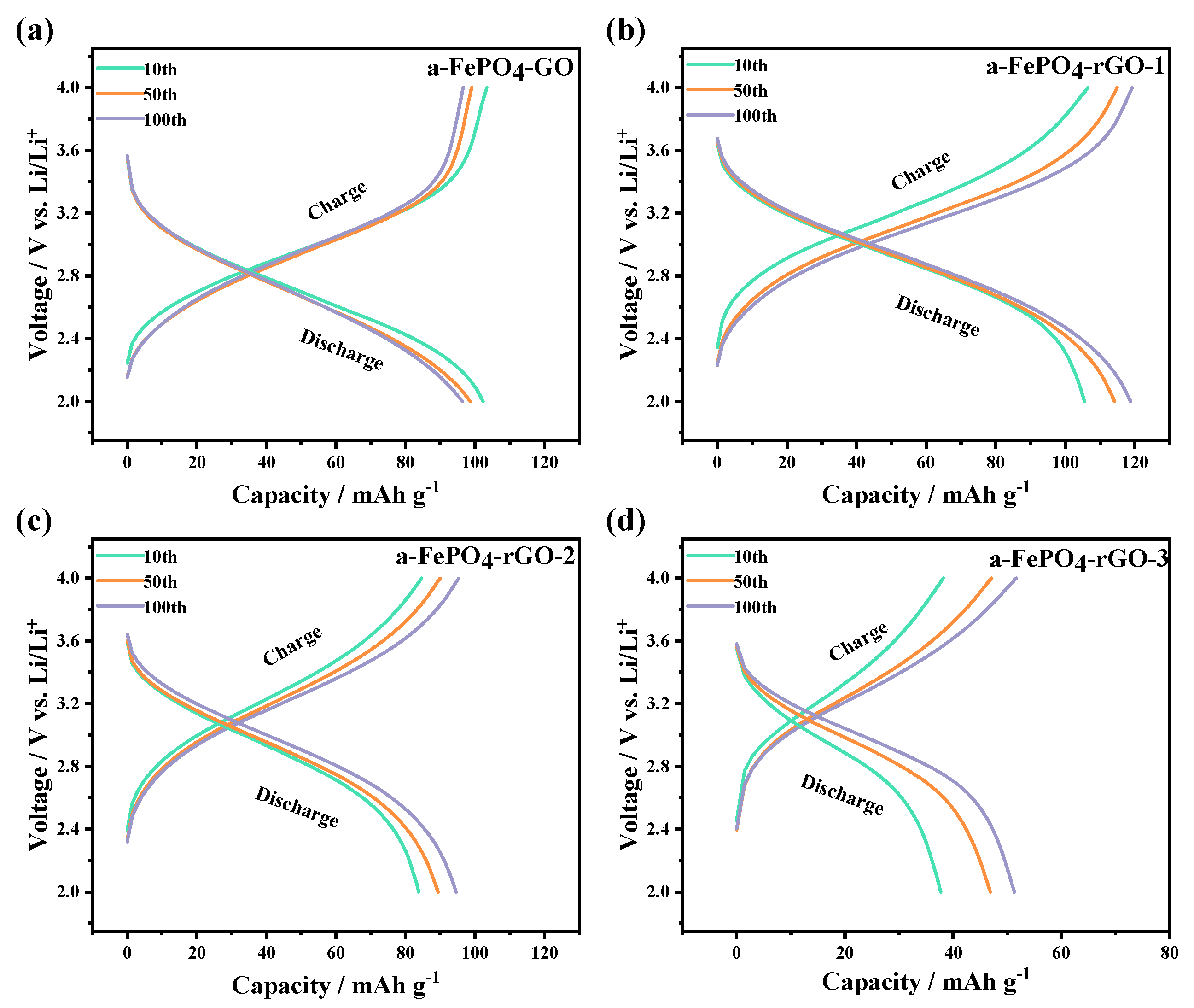 The charge–discharge curves of lithium-ion batteries reflect the thermodynamic and kinetic characteristics of their internal electrochemical reactions. Figure 4 displays the charge–discharge curves at the 10th, 50th, and 100th cycles for a-FePO4-GO and its high-temperature calcined composite electrodes, measured at a 1C rate. The results indicate that all four electrodes (a-FePO4-GO and a-FePO4-rGO-1/-2/-3) exhibit smooth, inclined charge–discharge profiles without distinct voltage plateaus and demonstrate a high overlapping degree among consecutive cycles. Among them, the a-FePO4-rGO-1 electrode (Figure 4b) delivered the best electrochemical performance, retaining a discharge specific capacity of 117 mAh·g−1 after 100 cycles. In comparison, the a-FePO4-GO electrode (Figure 4a) maintained a capacity of 95 mAh·g−1 under the same conditions. The superior performance of a-FePO4-rGO-1 is attributed to the reduction in GO to rGO during calcination at 250 °C under N2 atmosphere. The resulting rGO, exhibiting a structure analogous to single-layer graphene, significantly enhances lithium-ion conductivity. As shown in Figure 4c,d, the a-FePO4-rGO-2/-3 electrodes exhibited much lower discharge specific capacities of 95 mAh·g−1 and 50 mAh·g−1 after 100 cycles, respectively. Although all three types of a-FePO4-rGO composites remained amorphous in structure according to XRD, their electrochemical performance varied considerably with increasing calcination temperature. The degradation in charge–discharge behavior at higher temperatures may be due to a tendency of a-FePO4 to transform toward the crystalline phase, which is consistent with XRD observations. Higher temperatures promote the formation of crystalline FePO4, a more thermodynamically stable phase that hinders lithium-ion intercalation and deintercalation, leading to the rapid decline in capacity observed for a-FePO4-rGO-2 and a-FePO4-rGO-3. Furthermore, in contrast to the a-FePO4-GO electrode, the discharge specific capacities of the three a-FePO4-rGO electrodes gradually increased with cycling, indicating that the presence of rGO helps to stabilize and even enhance the cyclic performance of lithium-ion batteries [29].
