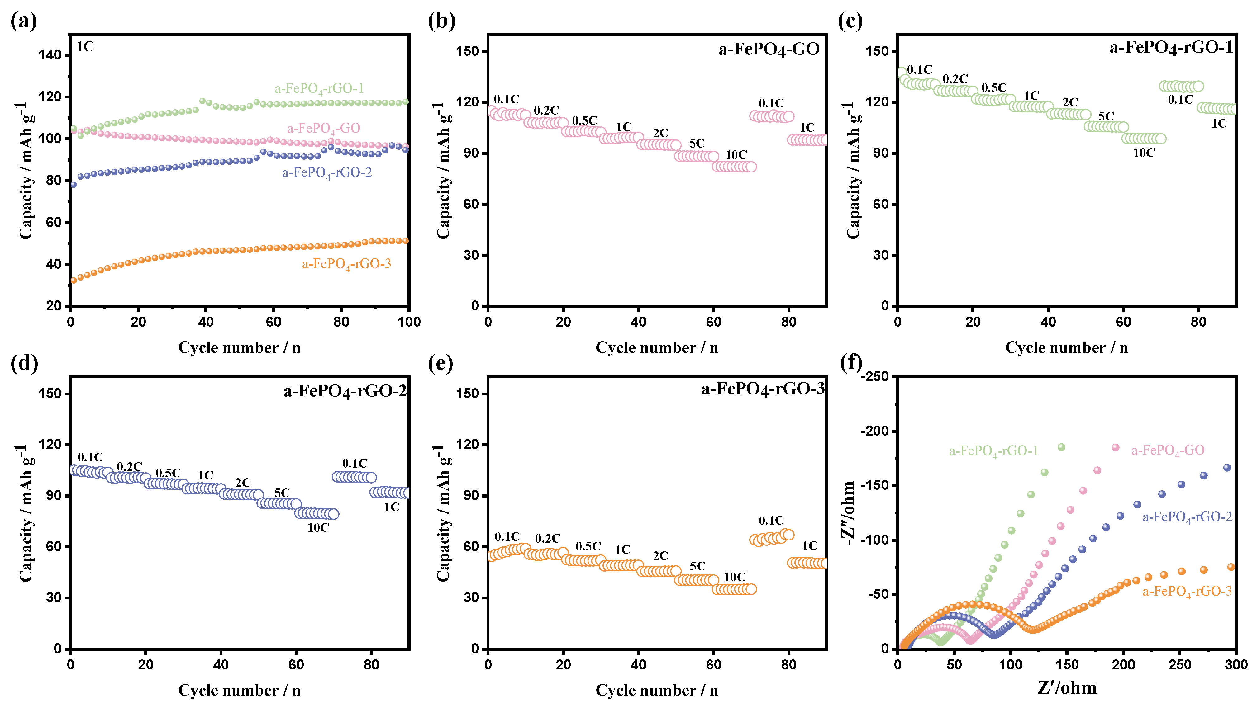 Figure 5. (a) Cyclic charge/discharge performance of a-FePO4-GO and a-FePO4-rGO-1/-2/-3; (be) Rate capability curves of a-FePO4-GO and a-FePO4-rGO-1/-2/-3 electrodes at various rates from 0.1 C to 10 C; (f) EIS plots of a-FePO4-GO and a-FePO4-rGO-1/-2/-3.