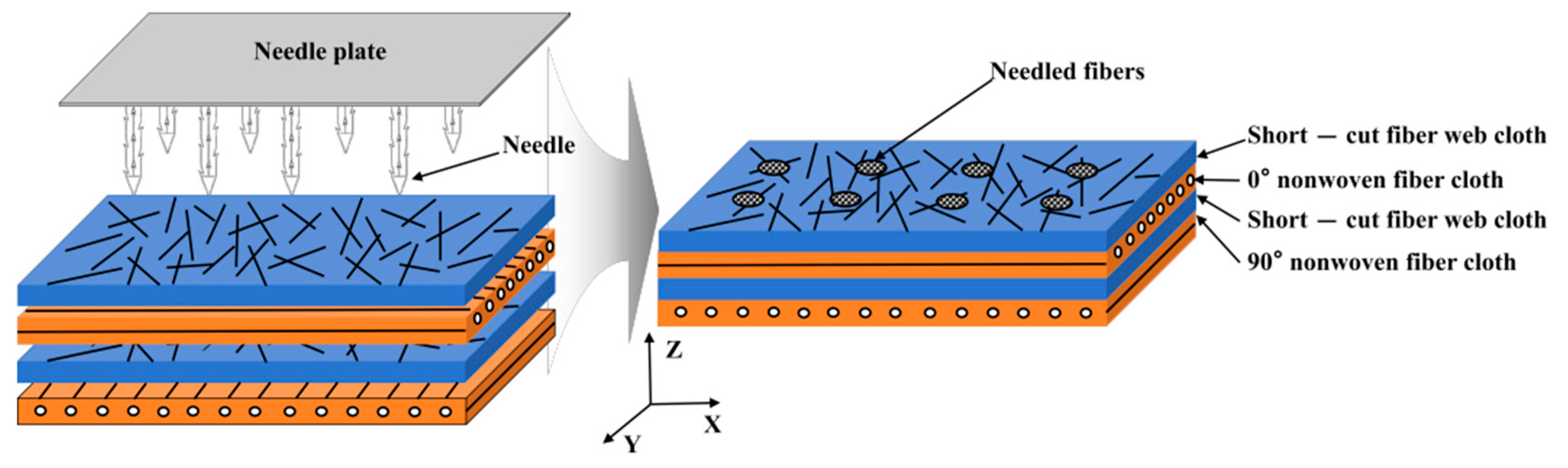 - Rotating the composite stack horizontally by 90° and repeating the needling process to ensure uniform consistency of needle perforations along both the x- and y-axes of the material.