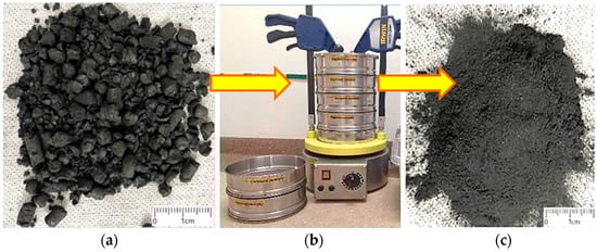 Carbonisate (a) after pyrolysis, (b) sieve shaker and (c) after crushing and screening to a 500 μm fraction.
