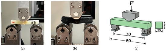 Sample from series B (a), series with added carbonisate B1 (b), (c) geometry and dimensions of samples for three-point bending test (g—sample thickness).