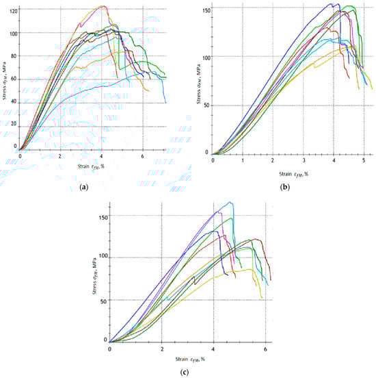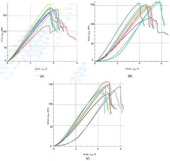 Stress–strain relationships obtained from the three-point bending test for epoxy–glass composites: (a) Group B, (b) group B1 and (c) group B2.