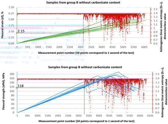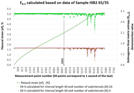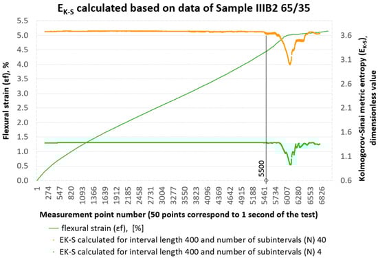 The calculation process itself was performed using the proprietary programme ‘Entropy K_S’ ver. 1.20 [21]. At this point, it is worth explaining how the initial parameters, i.e., the assumed interval length and the number of subintervals assumed for this interval—N from Formula (1), affect the obtained calculation results. To illustrate the procedure of the analysis, calculations were carried out for one of the representative specimens from group B2. On the set of deformations of the sample marked as IIIB2 calculations were performed for an interval with a length of 400 measurement points and 4 subintervals and 40 subintervals, respectively. The results of the calculations are shown in Figure 7. In this figure, we can see that the initial value of changes depending on the number of subintervals used. Increasing the number of subintervals increases the initial value of the metric entropy. In Figure 7, both curves (orange and green) show no visible fluctuations until approximately measurement point no. 5500. This is the value at which material damage is visible to the naked eye. The use of such a long interval (400 measurement points) for calculations does not add anything new to what we obtain from the strength testing machine itself in a three-point bending test, i.e., the values and (flexural strength and flexural strain). Even with varying numbers of subintervals, from 4 to 40, the method remains insufficiently sensitive to detect minor internal changes in the structure of the loaded composite.