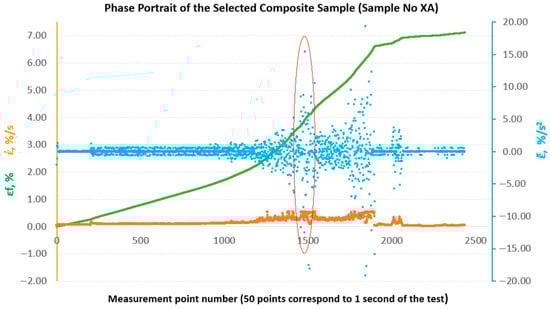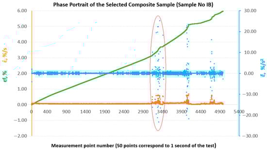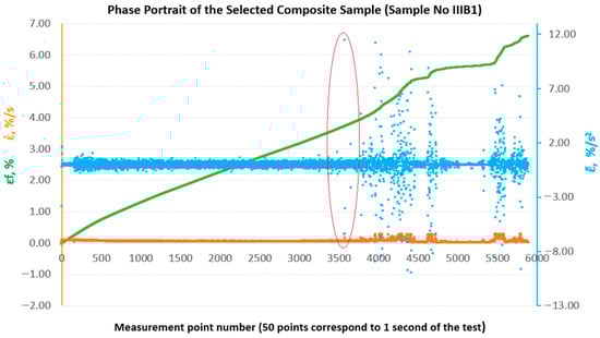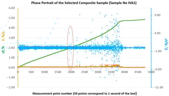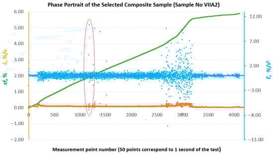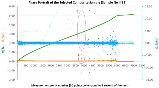 In the past, attempts have been made to reconstruct the phase space for the results of strength tests of composite materials in comparison with the results of metric entropy calculations [28]. Figure 9 shows phase portraits obtained from the set of strains of the sample analysed above, No. IIIB2. In our case, the phase portraits represent, respectively, —strain rate and —strain acceleration, which are the first and second derivatives of strain with respect to the measurement sequence, which, in practice, can be treated as a time-dependent function (50 consecutive measurement points correspond to 1 s of testing). In Figure 9, the phase portraits and begin to become clearly jagged (areas 1 and 2 marked in red in Figure 9) from the measurement point around number 3800, which coincides with a local decrease in the value of calculated for an interval of 40 measurement points (Figure 8).