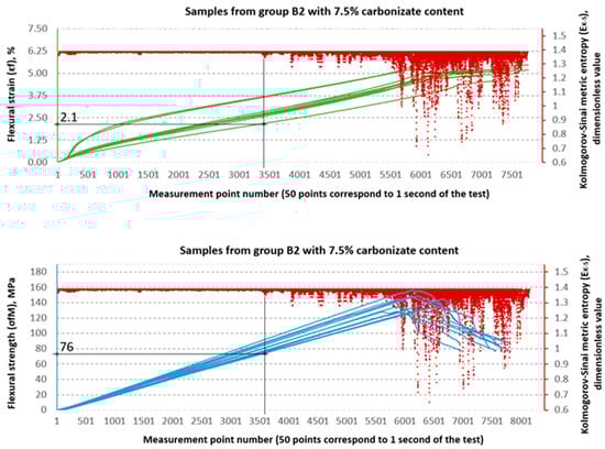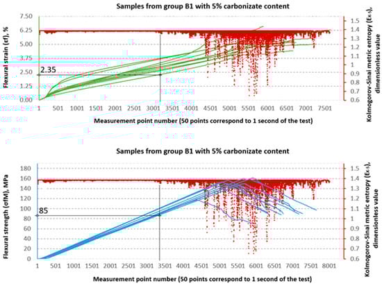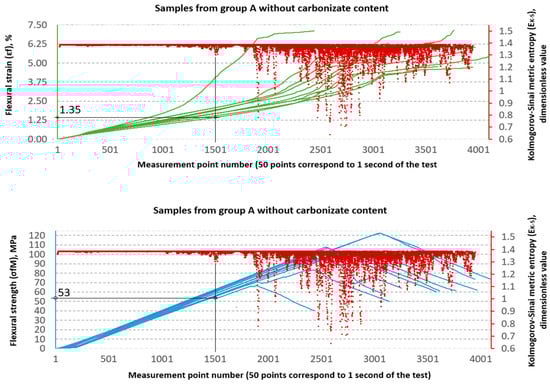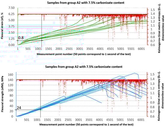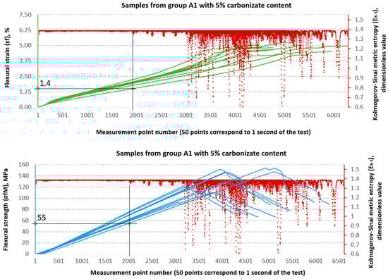 The Kolmogorov–Sinai metric entropy approach method was used to assess the durability of epoxy–glass composites with the addition of carbonisate. According to the authors, this method allows for a relatively simple determination of the safety factors necessary for the design of bent structures made of this material. The six consecutive figures below, i.e., Figure 15, Figure 16, Figure 17, Figure 18, Figure 19 and Figure 20, present a summary of the calculation results for all six groups of tested materials, i.e., A, A1, A2, B, B1 and B2. Each of the figures below consists of two parts. The upper part of the figures shows the deformation curves (green) as a function of successive measurement points, i.e., as a function of time. The lower part of the figures show the stress curves (blue), also as a function of successive measurement points in the test. Both parts of the graphs show the summary results of the calculations. The graphical summary of the calculation results take the form of a scatter plot (, 1 value point corresponds to 40 points of the interval for which this value was calculated) [21]. In Figure 15, Figure 16, Figure 17, Figure 18, Figure 19 and Figure 20, the smallest values obtained for each group of materials, expressed as the % deformation and stress values expressed in MPa, at which significant qualitative changes in the material structure occur, are marked with black lines and described on the axes. These values are denoted as: and , respectively. The values were verified each time by creating phase portraits and , as described in Figure 9.