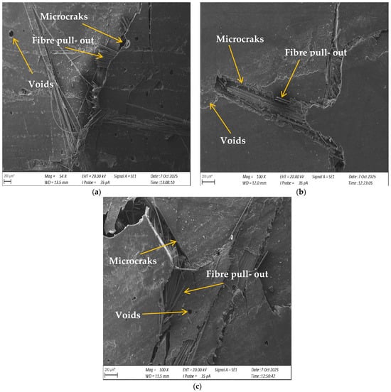 Reference laminate (a) exhibits a relatively uniform surface with well-embedded glass fibres and limited fibre pullout, indicating good adhesion between the matrix and reinforcement. In contrast, laminate B1 (b) exhibits voids, local microcracks and partial fibre debonding, suggesting that the addition of 5% char slightly reduces interfacial adhesion. The most pronounced structural degradation is seen in laminate B2 (c), where larger cracks, voids and extensive fibre pullout can be observed. These microstructural features correlate with the decrease in flexural strength observed for the 65/35 composites, indicating that excessive filler content can cause defect formation that acts as a crack initiation site.