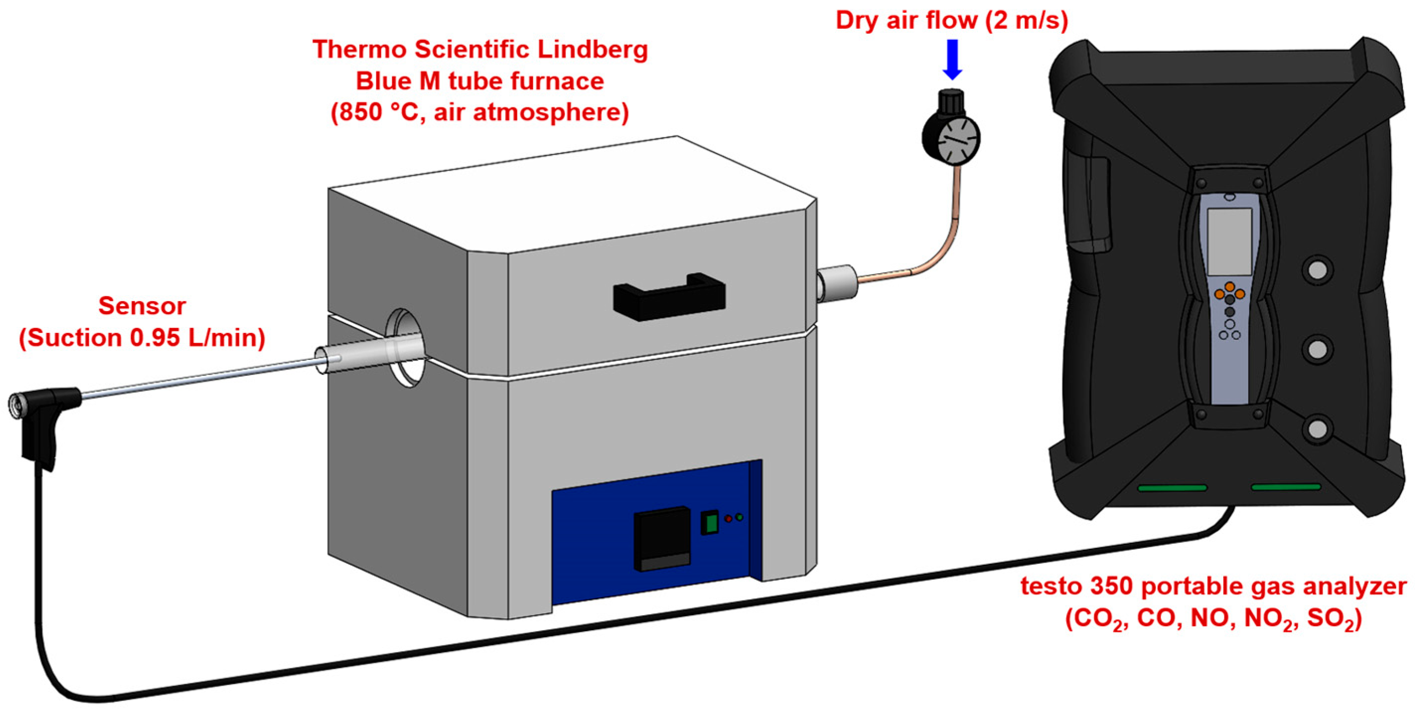 All experiments were conducted at ambient pressure and temperature (~101.3 kPa, 22 ± 2 °C). Gas concentrations were measured using the testo 350 portable gas analyzer (Testo, West Chester, PA, USA) with the following specifications: