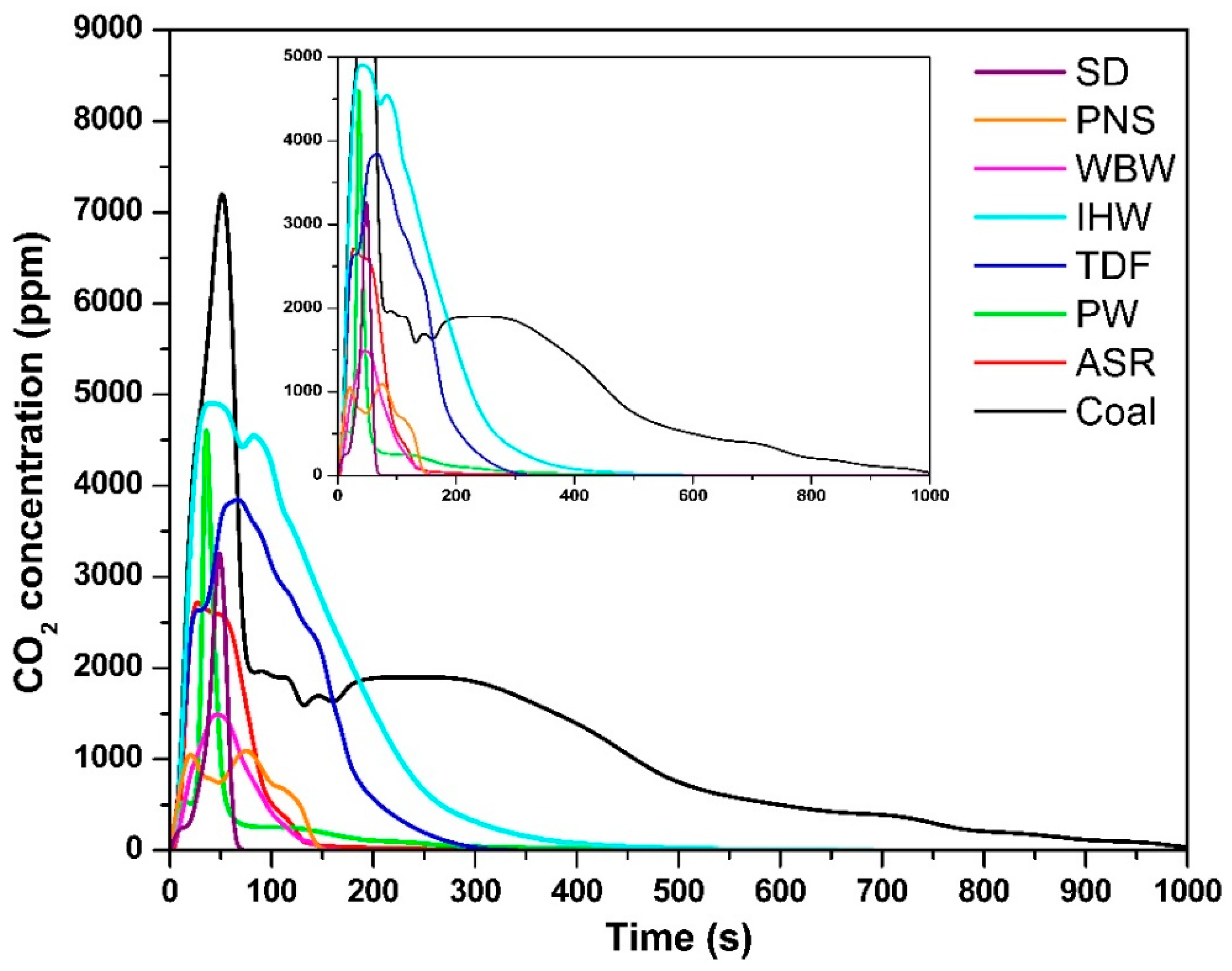 The temporal evolution of CO2 concentrations for all tested fuels is shown in Figure 2. The alternative fuels exhibited maximum CO2 concentrations of 3280 ppm (SD, 47 s), 1046 ppm (PNS, 22 s), 1468 ppm (WBW, 45 s), 4854 ppm (IHW, 53 s), 3795 ppm (TDF, 62 s), 4478 ppm (PW, 37 s), and 2713 ppm (ASR, 28 s), compared to coal’s 7158 ppm (51 s). A distinct combustion pattern emerged among the biomass- and plastic-based materials (SD, PNS, WBW, PW, and ASR), which demonstrated accelerated CO2 release kinetics. This behavior is primarily attributed to their elevated volatile matter content, which enhances fuel reactivity and promotes rapid thermal decomposition upon exposure to high temperatures [9]. These observations align with those of Ozer et al. [30], who demonstrated that a high volatile matter content facilitates faster CO2 evolution due to the preferential oxidation of light organic compounds containing carbon, hydrogen, and oxygen fragments [31].