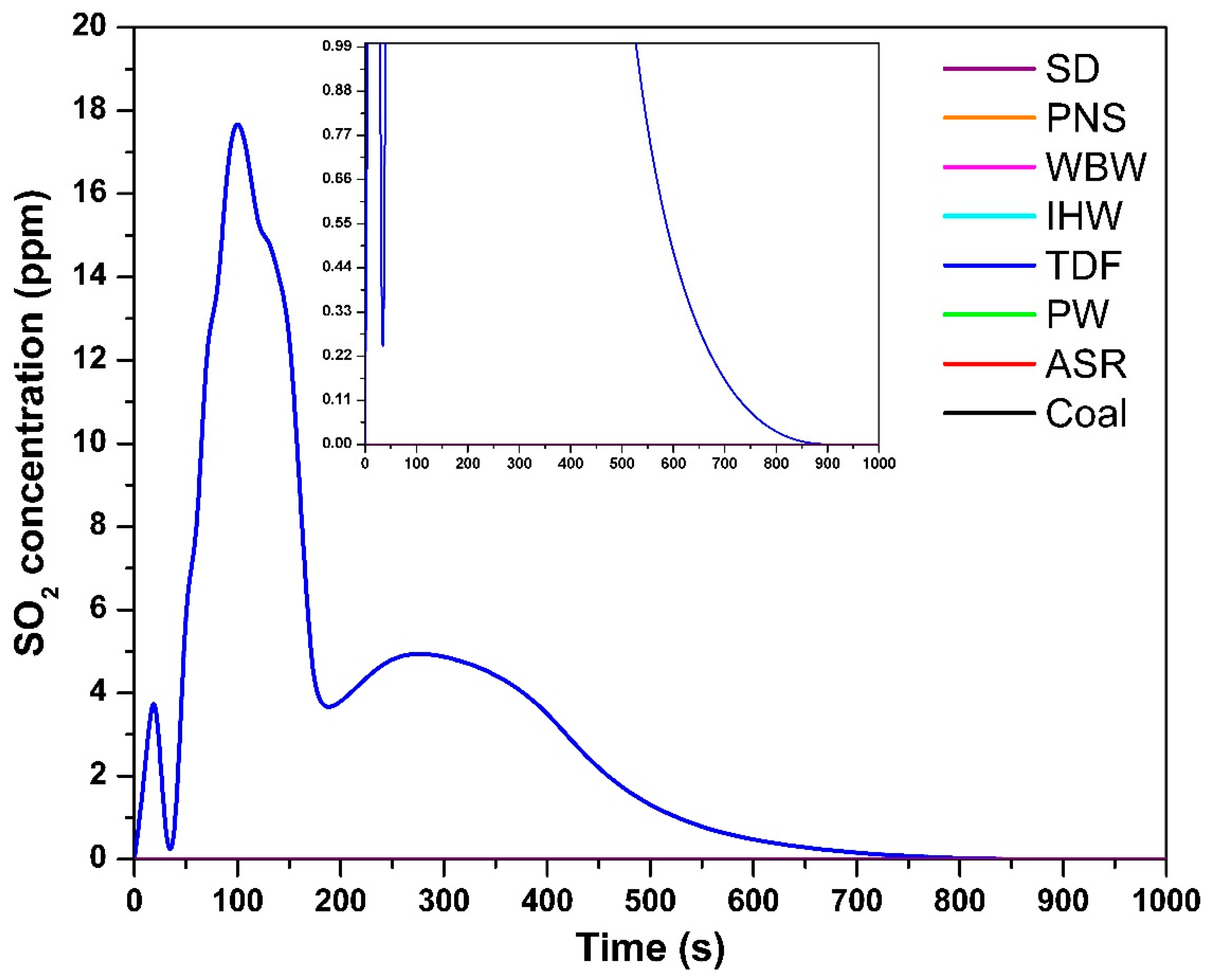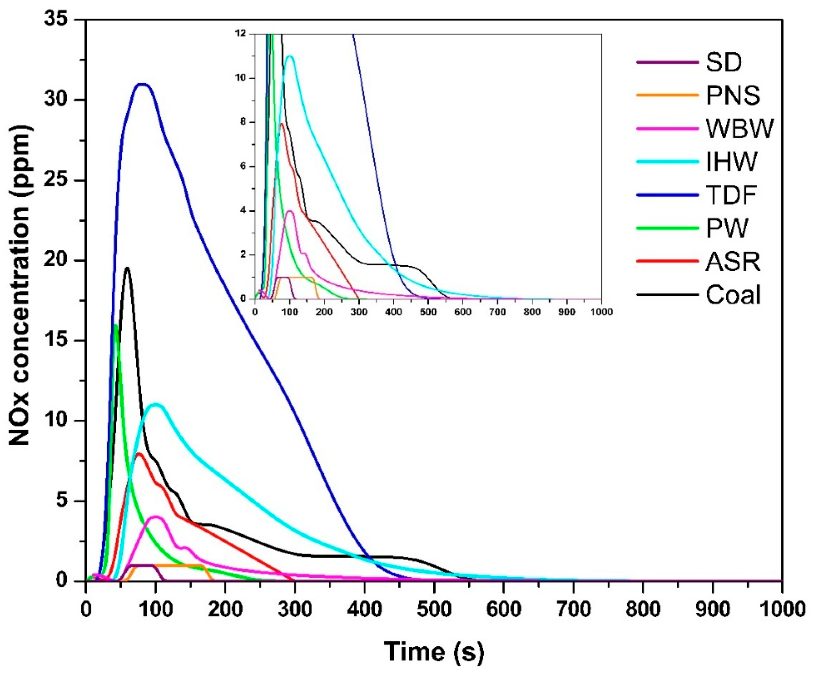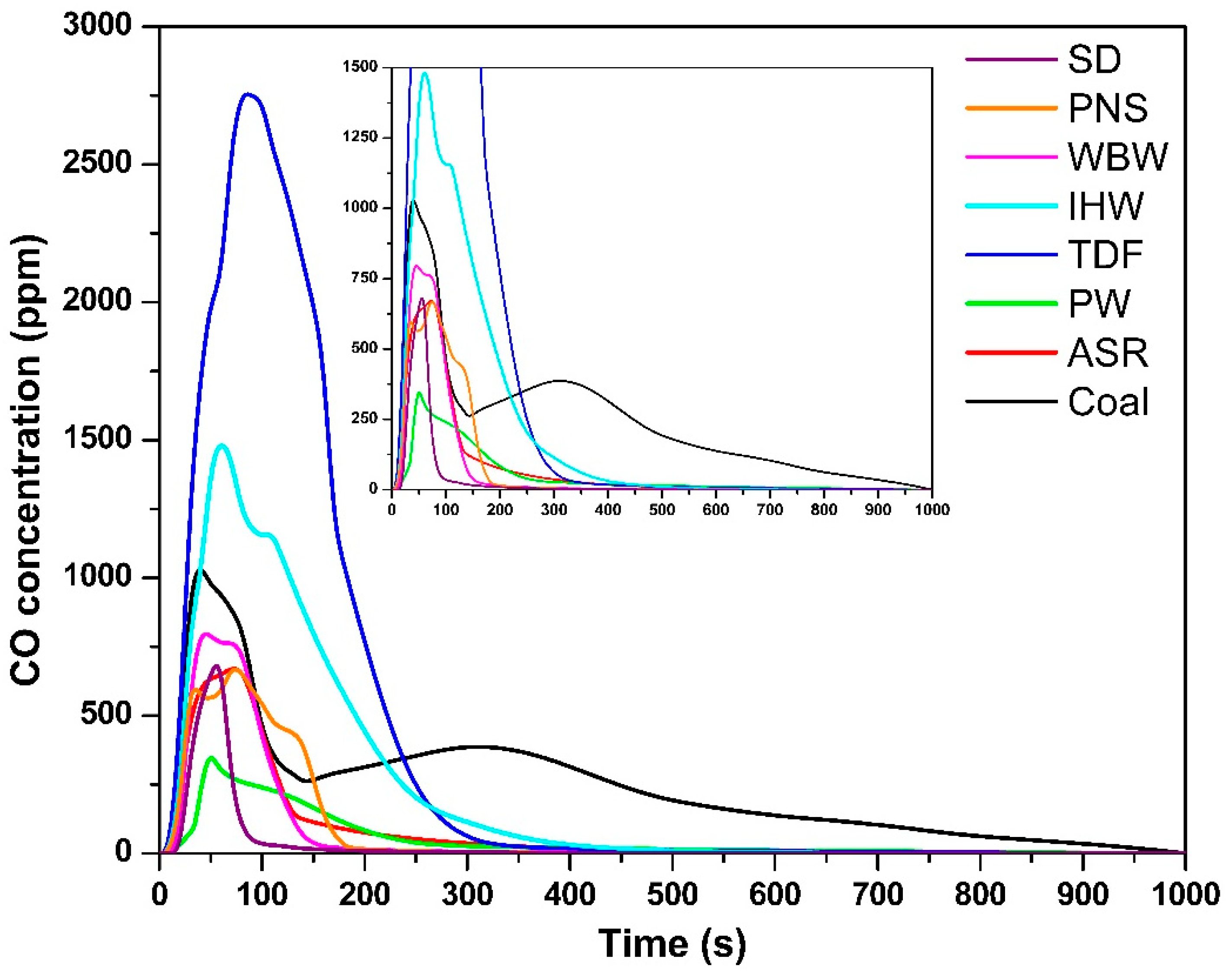 The temporal CO concentration profiles (Figure 3) followed similar trends to those observed for CO2 emissions. The maximum CO concentration for each fuel was as follows: SD—647 ppm, 55 s; PNS—666 ppm, 73 s; WBW—790 ppm, 45 s; IHW—1466 ppm, 60 s; TDF—2752 ppm, 88 s; PW—332 ppm, 50 s; ASR—670 ppm, 70 s; and coal—980 ppm, 37 s. Notably, IHW and TDF generated the highest CO emissions, substantially exceeding those of other fuels, including coal. This elevated CO production is attributed to their complex chemical composition, which includes synthetic polymers, rubber compounds, heavy hydrocarbons, and various chemical additives [9]. These components hinder complete combustion and promote the formation of CO as an intermediate oxidation product, particularly during the initial combustion phases [39]. This finding is consistent with those of Carmo-Calado et al. [40], who reported that structurally complex fuels tend to produce elevated CO levels due to incomplete combustion processes. Despite the provision of excess oxygen in the experimental setup, CO formation represents a typical intermediate step in the combustion process that cannot be completely eliminated [32].