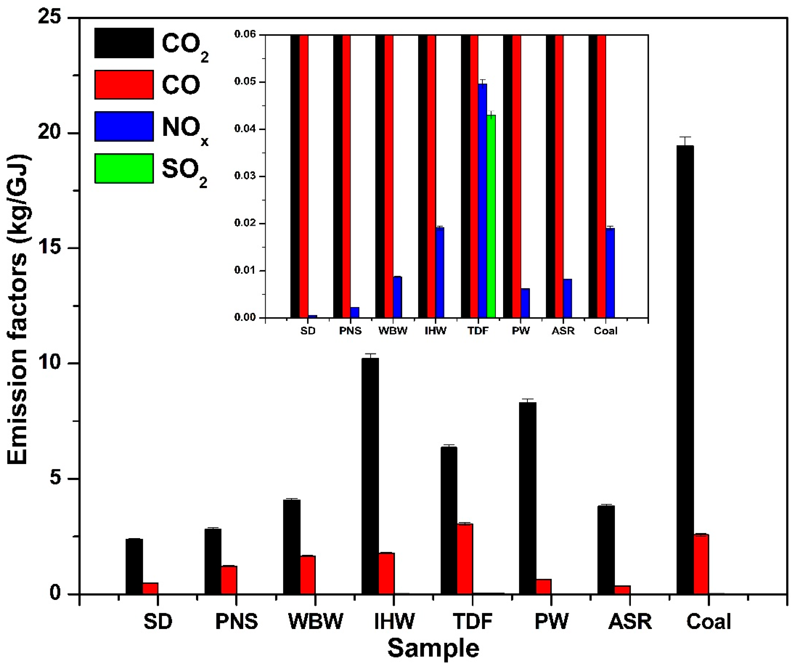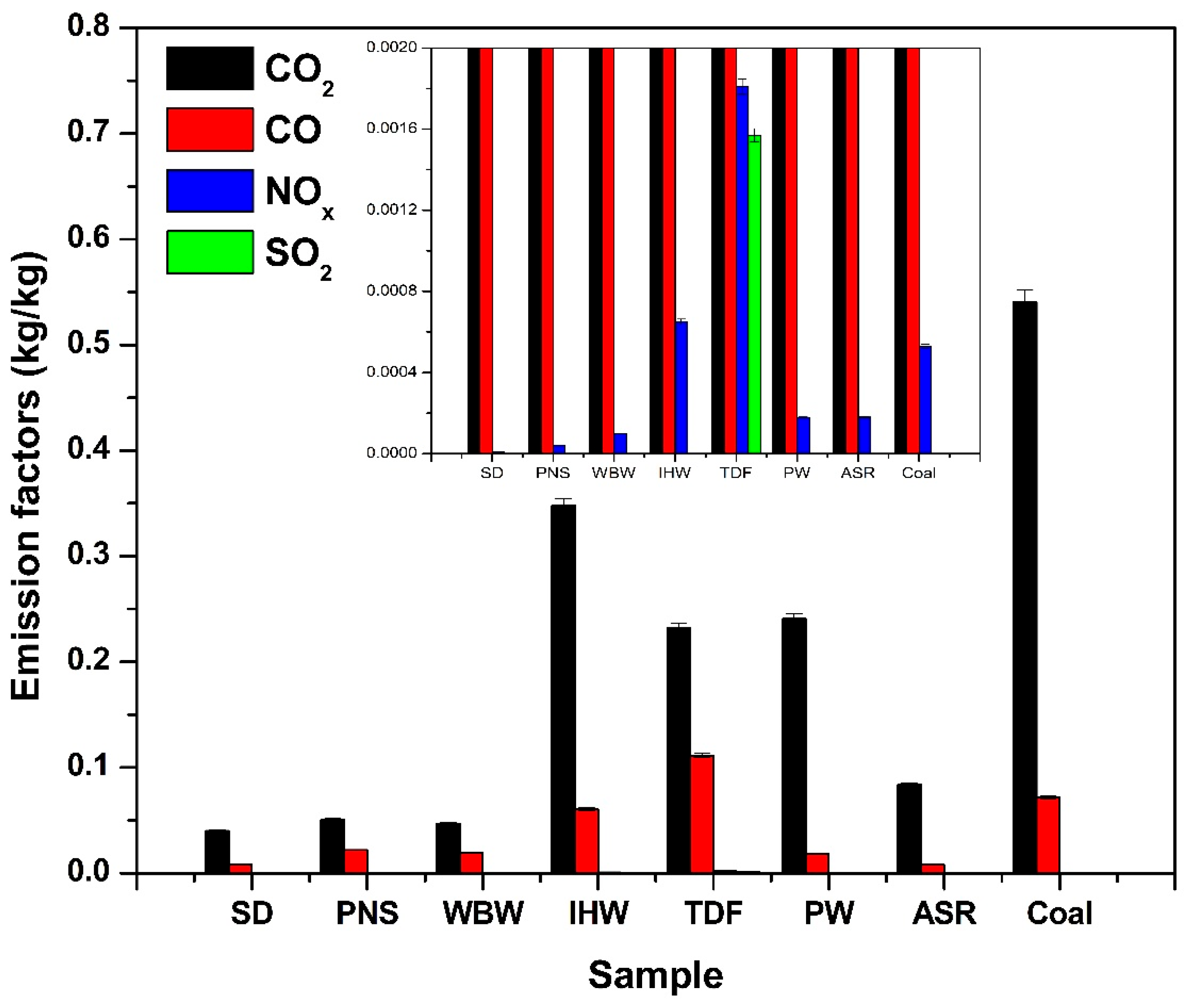 All experiments were performed in triplicate (n = 3) for each fuel type to quantify experimental variability and ensure reproducibility. Each replicate consisted of an independent combustion test with a fresh sample (1.000 ± 0.001 g) under identical conditions. Reported emission factors represent mean values from three replicates, with uncertainties expressed as standard deviations.