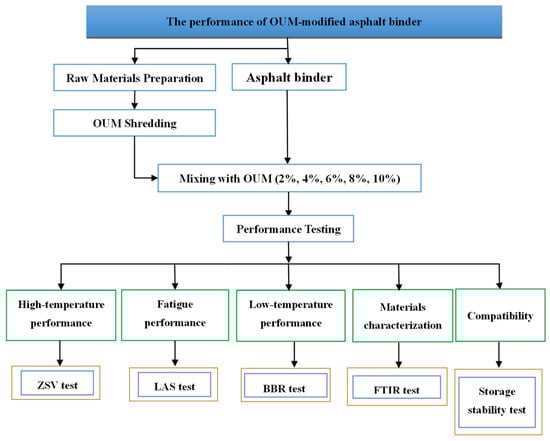 Grounded in previous research, this investigation is driven by the urgent need to tackle both the deteriorating effectiveness of conventional asphalt and the environmental challenges resulting from improper disposal of OUM. While the use of polymers to modify asphalt is well-established, this study focuses on the specific application of waste OUMs as a functional modifier. The innovation, therefore, lies not in the creation of a new polymer modifier, but in providing a practical and effective recycling pathway for a problematic waste stream. Accordingly, the present research is designed to rigorously examine how different proportions of OUM influence the performance of binders across at elevated, moderate, and low temperatures, employing experimental lab methods. The key aims have been defined as outlined below: