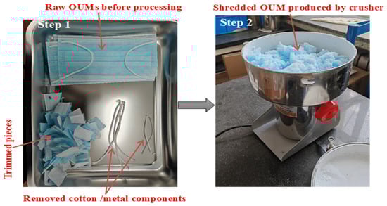 Unutilized OUM was employed for assessment, with the relevant physical characteristics shown in Table 2. Before the experimentation, the OUM’s metallic and cotton components were eliminated. The cleaned OUM was then trimmed into sections roughly 0.03 m in width and 0.05 m in length, and these OUM pieces were subsequently processed in a crusher to yield shredded OUM, which is depicted in Figure 2.