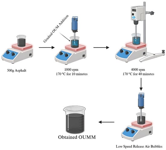 Samples in this study were prepared employing high-shear as well as mechanical mixers. The study utilized five varying OUM concentrations 2%, 4%, 6%, 8%, and 10% in terms of their weight compared to the asphalt. Initially, 500 g of base asphalt was liquefied by heating, and OUM was slowly incorporated in measured increments. The mixture was mechanically mixed at 1000 rpm for 10 min before being exposed to high-shear mixing at 4000 rpm and 170 °C for 40 min [68]. For the purpose of expelling any remaining air, the compound was stirred gently using a mechanical mixer set to a low speed for ten minutes, as demonstrated in Figure 3.