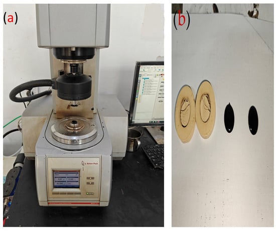 The ZSV of asphalt binder demonstrates a strong association with its capacity to resist rutting, thereby serving as a reliable parameter for evaluating performance at elevated temperatures. This ZSV, defined as the viscosity at nearly zero shear rate (η0) [69], was determined via steady-state flow testing using a DSR device (Anton Paar, Graz, Austria) (Figure 4a) on binder samples (0.025 m diameter, 0.001 m thickness, Figure 4b), at 60 °C. Figure 4a presents the MCR302 Dynamic Shear Rheometer (Anton Paar, Graz, Austria) utilized for evaluating the high-temperature rheological characteristics of both unmodified and OUMM. This precision rheometer employs a parallel plate geometry (25 mm diameter, 1 mm gap) to subject specimens to controlled shear deformation under isothermal conditions at 60 °C. The instrument measures the phase angle (δ) and complex shear modulus (G*), enabling determination of the zero-shear viscosity through steady-state flow testing across shear rates ranging from 0.01 to 100 s−1. The DSR’s capability to characterize non-Newtonian flow behavior is critical for understanding the polymer network formation within the OUMM which manifests as pronounced shear-thinning characteristics indicative of successful binder modification. In Equation (1) [70], the Carreau model is mathematically represented.