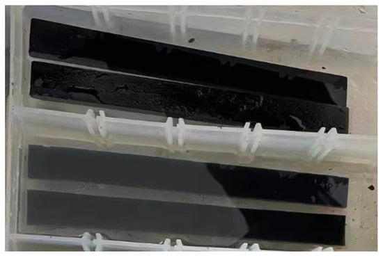 The BBR procedure, implemented according to the AASHTO T313-12 standard, examined the asphalt binder’s tendency to crack in cold climates. This testing approach focuses on the measurement of creep stiffness and creep rate, both critical for assessing the binder’s performance against low-temperature cracking. The experiment was conducted at temperatures of −6 °C, −12 °C, and −18 °C, utilizing binder beam specimens shaped as rectangles (Figure 5), each measuring 0.125 m in length, 0.0125 m in width, and 0.00635 m in thickness. All beam samples underwent loading at a constant force of 0.98 N over a 240 s period. Center-point deflections were measured at designated time intervals (8, 15, 30, 60, 120, and 240 s) and mapped as a function of time. The m-value representing creep rate and the S value for creep stiffness at 60 s were calculated and subjected to further analysis.