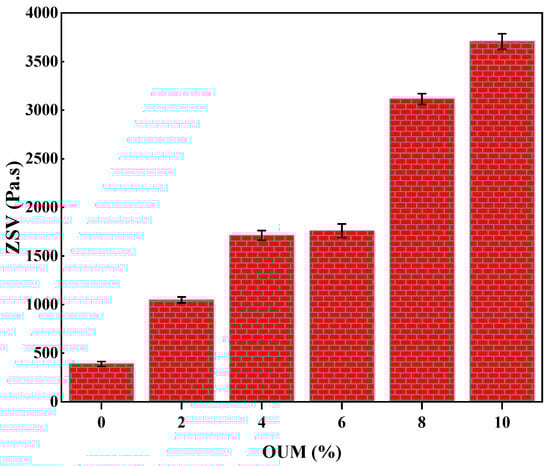 The incorporation of OUM fundamentally transformed the high-temperature rheological characteristics of asphalt binder, a critical determinant of pavement resistance to permanent deformation. As illustrated in Figure 6, the ZSV as a key indicator of a material’s resistance to flow under terminal conditions, underwent a substantial and systematic augmentation with increasing OUM content. This phenomenon is rooted in the physical interactions between the asphalt binder and the PP polymer from the OUM. As confirmed by FTIR analysis which showed no chemical changes, the modification process involves the absorption of the asphalt’s lighter aromatic fractions (maltenes) by the PP chains. This causes the polymer to swell, forming an intricate, three-dimensional physical network [71]. This network structure, evidenced by the dramatic increase in viscosity, creates significant steric hindrance and a high density of entanglement points, which severely restricts the motion of the asphalt molecules [72]. Consequently, the energy required to induce flow is significantly increased, resulting in a dramatic rise in ZSV from below 500 Pa·s for the base asphalt to above 3500 Pa·s at 10% OUM. This enhancement of nearly an order of magnitude signifies a fundamental improvement in the material’s rutting resistance, a correlation well-established in asphalt rheology [73].