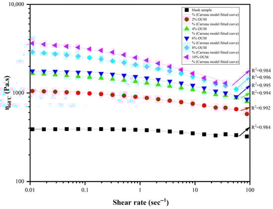 Beyond static resistance, the dynamic flow behavior of the modified binders, depicted in Figure 7, reveals a crucial transition from a simple viscous fluid to a complex, structured non-Newtonian system. While the base asphalt exhibits near-Newtonian behavior, the OUMM displays a pronounced shear-thinning rheological fingerprint, a classic hallmark of polymer-modified asphalts [74]. This behavior is a direct consequence of the polymer network’s response to external shear stress. At low shear rates, the swollen polymer chains exist in a randomly oriented, high-entropy coil conformation, maximizing intermolecular friction and resulting in the high viscosity observed in the ZSV. As the shear rate increases, the applied stress overcomes the network’s relaxation time, forcing the entangled chains to disentangle, uncoil, and align in the direction of flow [71]. This shear-induced anisotropy drastically reduces the hydrodynamic volume and internal flow resistance, causing the observed decrease in viscosity. The Carreau model, chosen for its ability to accurately capture this entire flow curve from the low-shear Newtonian plateau to the power-law region exhibited an excellent fit to the empirical data for all modified binders (R2 > 0.98), quantitatively validating this mechanistic interpretation.