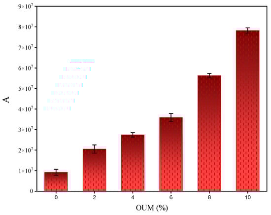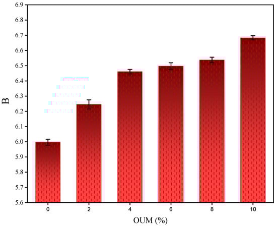 The fatigue resistance of the asphalt binders modified with varying percentages of OUM was evaluated using the LAS test, with the key performance parameters, A and B [76], derived from the VECD model, presented in Figure 8 and Figure 9. Parameter A correlates with the storage modulus G* cos δ of the binders and is employed to assess the integrity of the material subjected to cumulative damage throughout the loading phase. An elevated A value reflects enhanced fatigue resistance. Conversely, Parameter B illustrates the material’s responsiveness to different load intensities, where a lower value indicates diminished damage progression across diverse strain magnitude.