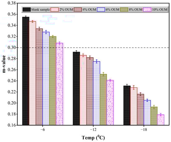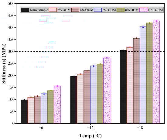 According to Figure 11 and Figure 12, the bending beam rheometry analysis determined the S and m-values of unmodified and OUMM-containing samples at −6 °C, −12 °C, and −18 °C. Figure 11 reveals that a reduction in test temperature results in a steady rise in S values. Furthermore, at any given temperature, asphalts modified with OUM consistently display higher S values than the base binder. The data also show that increasing OUM content leads to higher S values, suggesting that OUM modifiers adversely affect asphalt’s low-temperature performance. As depicted in Figure 12, lowering the test temperature results in the m-value following a pattern contrary to S. At equivalent temperatures, OUMM samples demonstrate notably smaller m-values relative to unmodified asphalt. This reduction becomes more pronounced with a higher OUM percentage, highlighting the negative influence of OUM addition on the low-temperature capabilities of asphalt. Additionally, both the unmodified and OUMM samples comply with the Superpave specifications and specifically, an S-value of no more than 300 MPa and an m-value not less than 0.30 at −6 °C. However, neither sample satisfies these requirements at −12 °C or −18 °C. As represented in Figure 12, the m-values recorded at these lower temperatures fall below the 0.30 threshold. The detrimental effects are attributable to the OUM swelling, which decreases the proportion of light fractions in the binder, thereby weakening their resistance to deformation under low-temperature conditions.