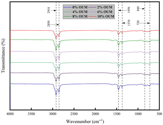 The analysis of chemical functional groups within asphalt binders is generally accepted as a critical step in uncovering the underlying modification mechanism. Figure 13 presents the FTIR analysis results for unmodified asphalt alongside those of OUMM. Absorption bands appearing at 2918 cm−1 and 2850 cm−1 correspond to the antisymmetric and symmetric stretching vibrations of methylene (CH2) groups, respectively. Similarly, signals at 1456 cm−1 and 1370 cm−1 are attributed to the antisymmetric and symmetric bending vibrations of methyl (CH3) groups. Additionally, bands between 870 and 670 cm−1 are due to C-H vibrational modes that indicate substitution on the aromatic ring. As a result, saturated hydrocarbons and unsaturated compounds like aromatics, primarily composed of methyl and methylene groups, constitute the key components of unmodified and modified samples. The FTIR spectra obtained from all samples reveal consistent patterns, with the unmodified asphalt exhibiting identical chemical functional groups to those found in samples containing 2%, 4%, 6%, 8%, and 10% OUMM. The unmodified asphalt and OUMM share the same active chemical functionalities, and the major absorption bands across all asphalt binder samples are comparable. No clear indication of chemical reactions or new functional groups emerges after incorporating OUM into the control binder, suggesting that the modification is chiefly physical rather than chemical.