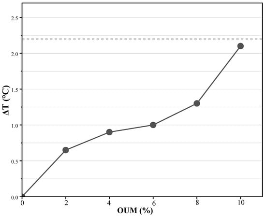 - Based on the balance of performance enhancement and material stability, a modification content of up to 10% OUM (by weight of asphalt) is considered a viable and effective concentration for achieving substantial performance gains without compromising the binder’s homogeneity. The enhanced high-temperature rheological properties indicate that OUM-modified binders are particularly well-suited for application in temperate and hot climates.