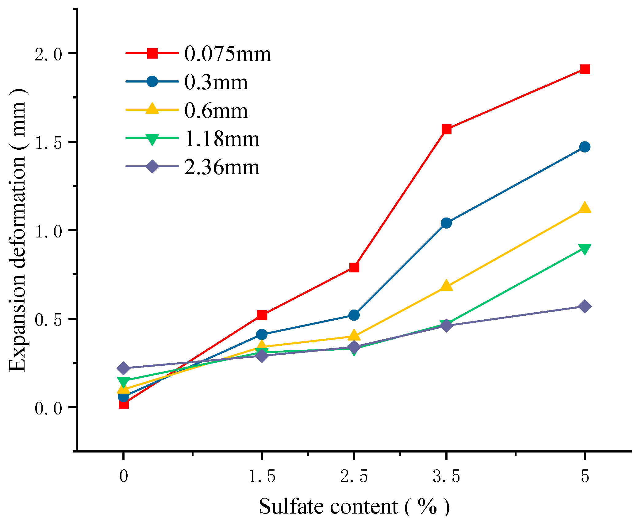 Figure 5, the levels of expansion deformation with different particle sizes are compared and analyzed. It can be seen that the expansion deformation in the sample is inversely proportional to the particle size of the macadam. The smaller the particle size, the smaller the mesopore size of the mixture structure and the greater the expansion deformation of the specimen under the same sulfate content. For example, when the sulfate content is 5%, the expansion deformation in the mixture with a gravel particle size of 0.075 mm is increased by 1.34 mm (+235%) compared with the mixture with a gravel particle size of 2.36 mm. According to the analysis of the expansion mechanism of sulfate erosion, when the sulfate content is constant, the crystal phase generated in the mixture can be determined. Therefore, the larger the initial porosity inside the structure, the stronger the ability to accommodate the crystalline phase, and the expansion deformation of the sample under salt erosion is relatively small. In addition, when the mixture does not contain salt, the specimen shows little expansion deformation. This is mainly because, under the condition of artificial maintenance, different parts of the sample undergo different degrees of dry–wet cycles, resulting in the loosening of the sample. Specifically, the larger the particle size of the mixture, the more loose deformation there is in the sample.
