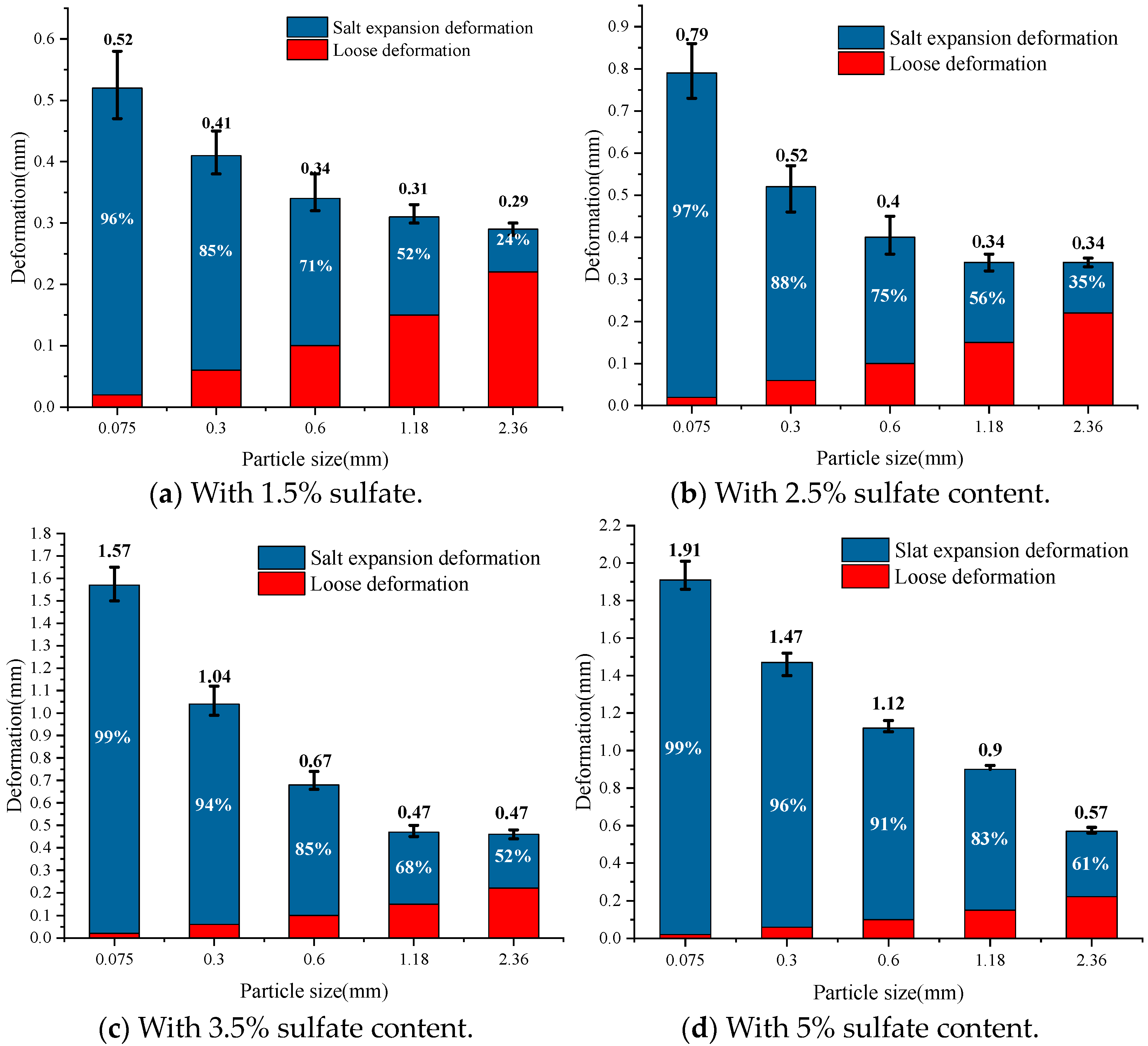 Figure 6. The actual salt expansion deformation caused by sulfate can be determined after the introduction of loose deformation for correction. Under the same salt content, the salt expansion deformation of the specimen decreases with the increase in the particle size of the macadam. The loose deformation increases with the increase in particle size. With the increase in sulfate content, the proportion of salt expansion deformation to the total deformation increases significantly. Specifically, when the sulfate content is 1.5%, the total deformation of the mixture with 0.075 mm particle size is 0.52 mm, and salt expansion deformation accounts for 96% of the total deformation. The total deformation of the mixture with a particle size of 2.36 mm is 0.29 mm, and the salt expansion deformation accounts for 24% of the total deformation. When the sulfate content is increased to 5%, the total deformation of the mixture with a 0.075 mm particle size is 1.89 mm, and the salt expansion deformation accounts for 99% of the total deformation. The total salt deformation of the mixture with a 2.36 mm particle size is 0.35 mm, and salt expansion accounts for 61% of the total deformation. It can be seen that the mixture with a smaller particle size is obviously affected by the sulfate content; the overall expansion deformation is larger, as is the proportion of salt expansion deformation. The mixture with a larger particle size is more stable under the influence of sulfate, the overall expansion deformation is smaller, and the proportion of salt expansion deformation is smaller.